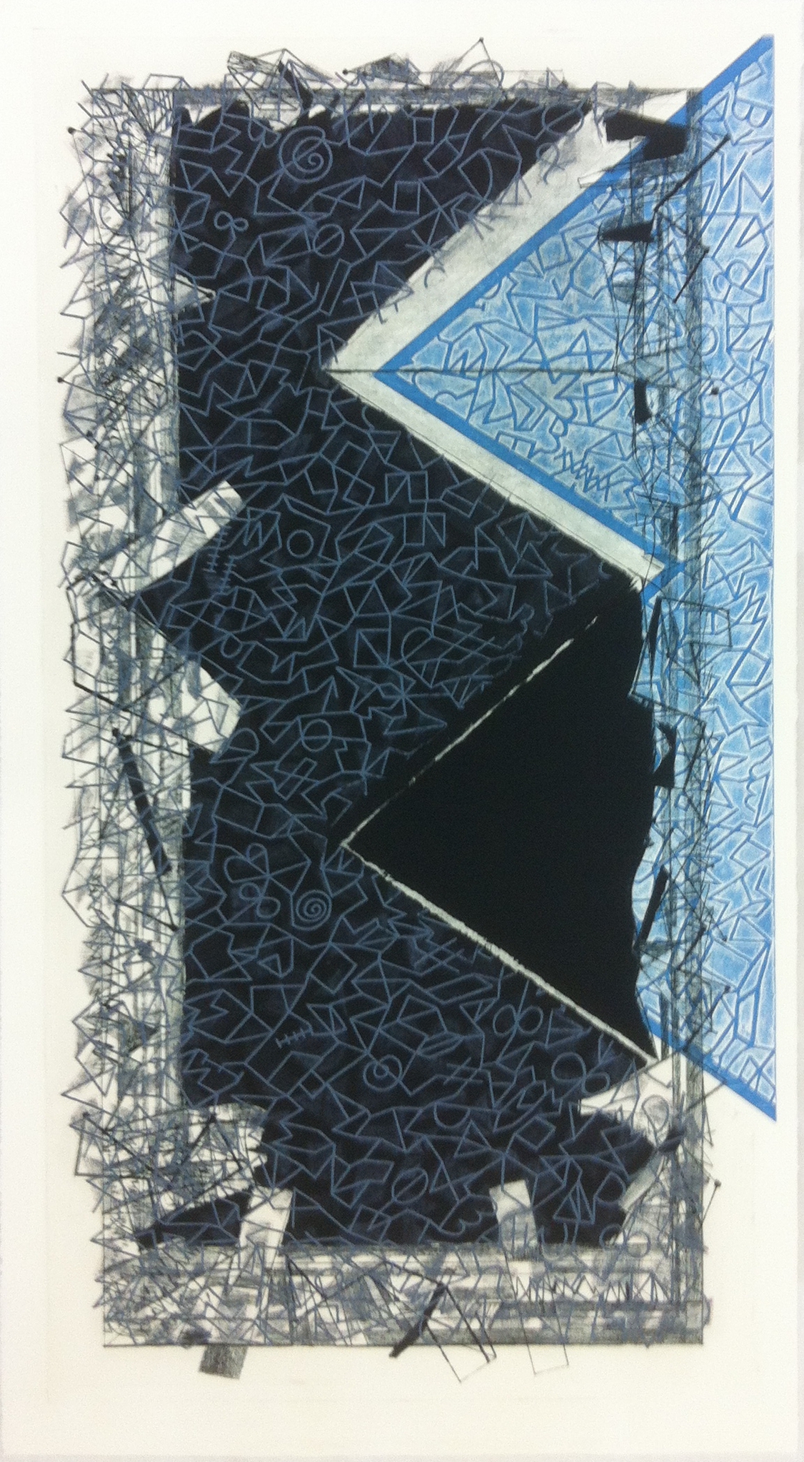 Monumentale prent met zwart en blauw fragment, een combinatie van ets,aquatint,mezzotint en droge naald. Te zien bij de tentoonstelling "Kunst en wetenschap raken elkaar" in het Huygensgebouw van de Radboud universiteit Nijmegen in 2021