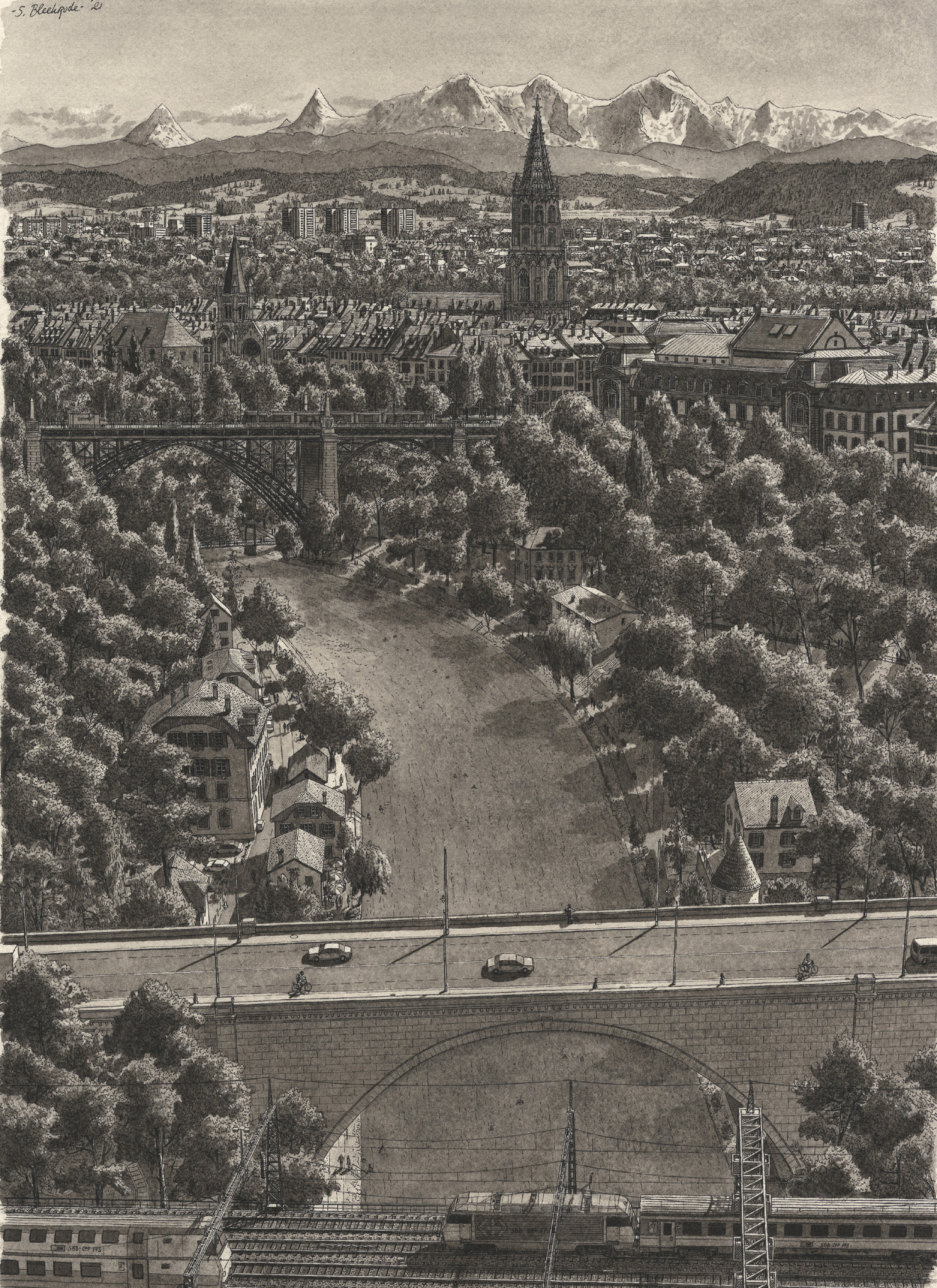 Landschap Art Tekening Kunst Bergen Landscape Drawing Realisme Realism Architectuur Architecture Stadsgezicht Mountains Zwitserland Cityscape Schweiz Switzerland Bern Berne
