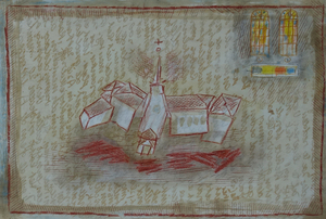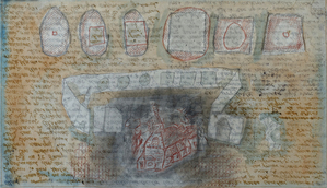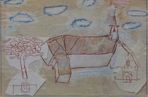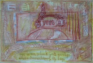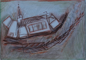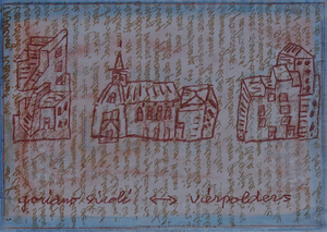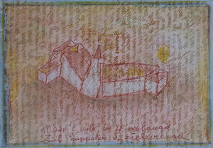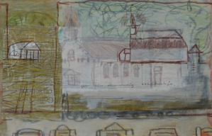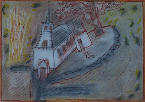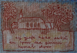 De mooiste bomen van het dorp vind je hier. Vooral de stokoude grove den (oudste rechten) met zijn raadselachtige reli-groei valt op. 's Zomers gaat het gebouwtje voor een groot gedeelte schuil achter het groen. Ik wilde dat deze kleine houtsnede er gebeiteld uit zag.