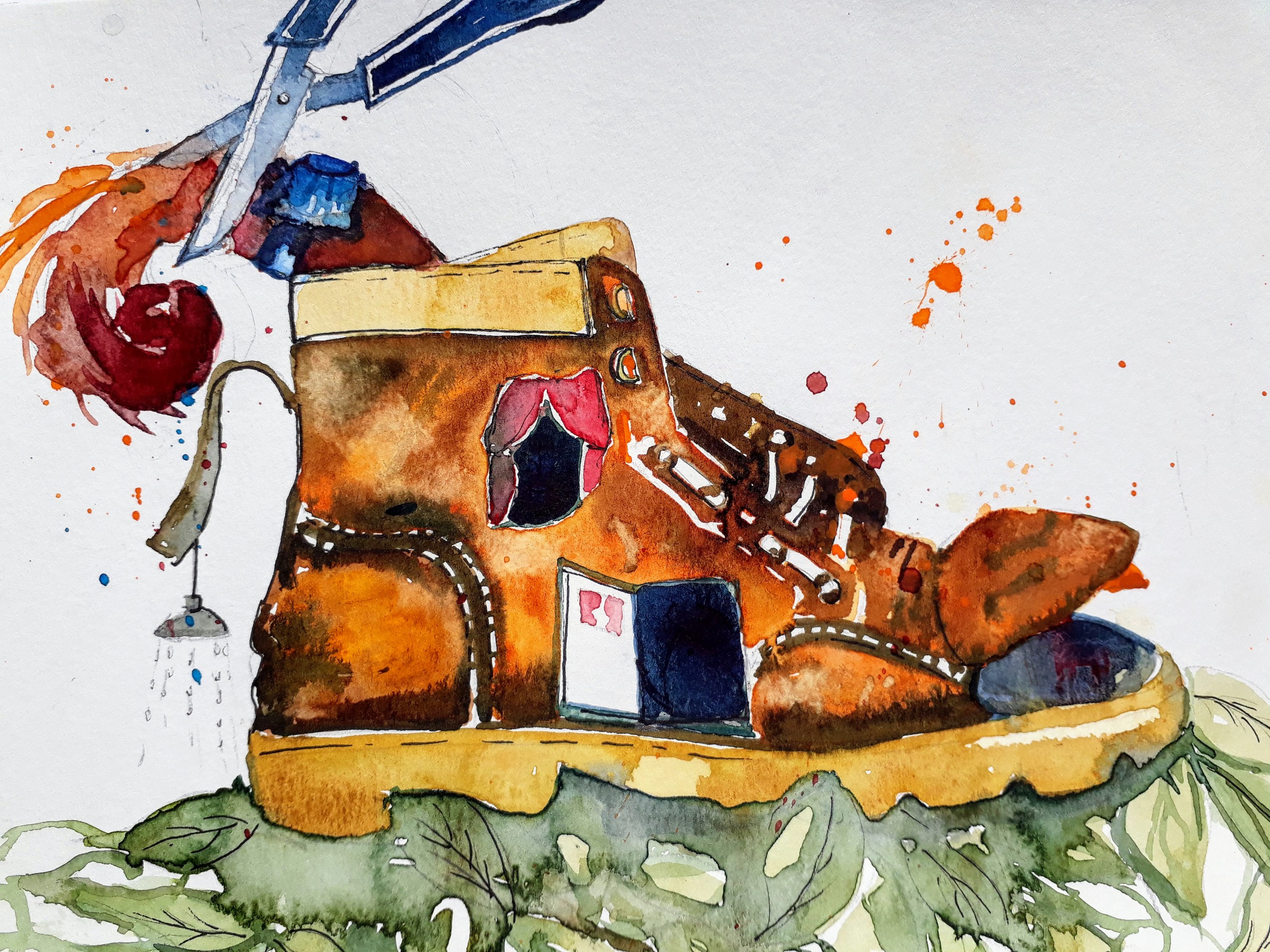 Aquarel en pen op 300 g papier. Ja Ratje mag even in de schoen van Eek, maar oei, wat doet Ratje?