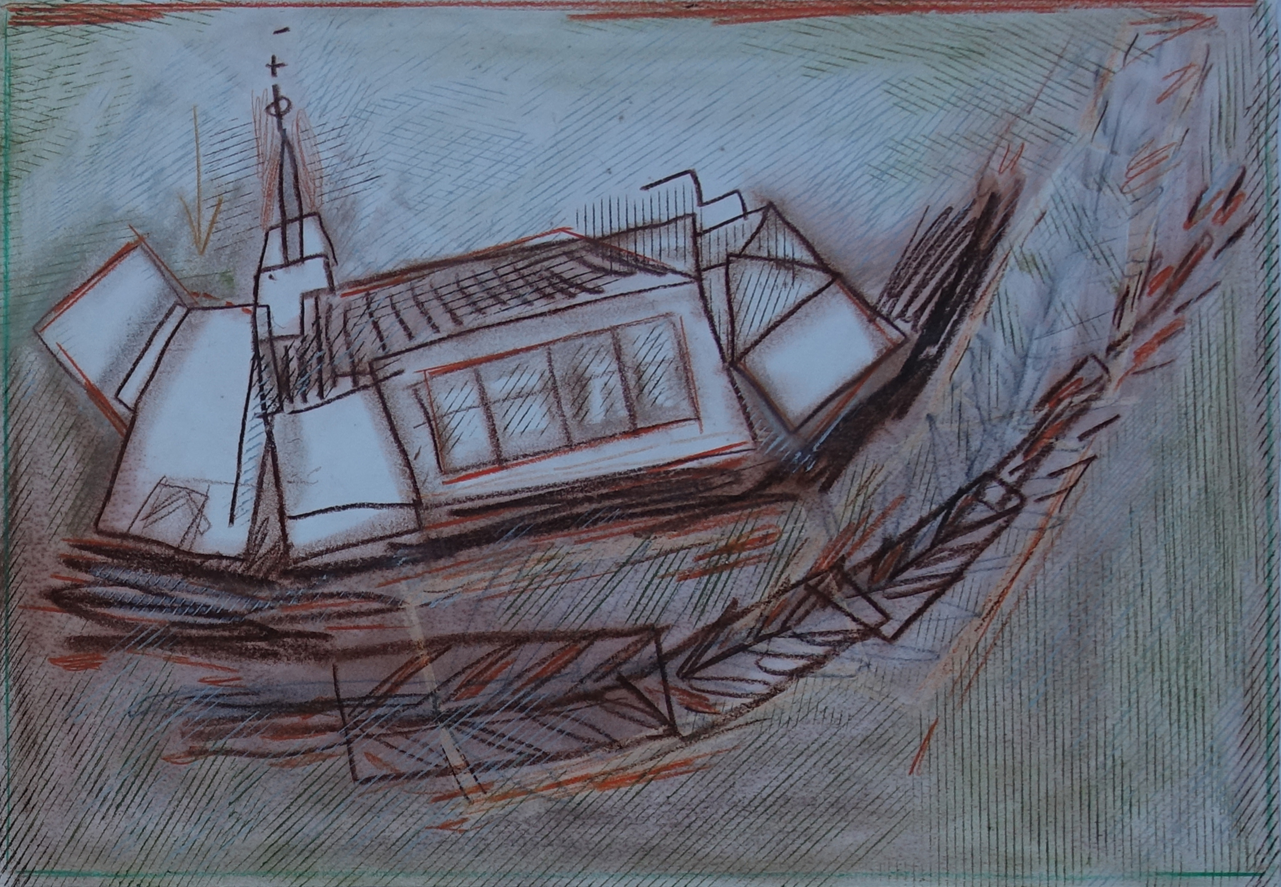 Neem je op de doorgaande weg de bocht naast Het kerkje, dan zie je in je ooghoeken het een en ander voorbij trekken. De verschillende aanzichten zoeken verbinding met elkaar. Hoeveel details heb je nodig voor een weergave? De oudere dame die al haar hele leven bij het kerkje woonde, wist niet hoeveel ramen er aanwezig waren. Toch twijfel ik geen moment aan haar kennis van het gebouw.