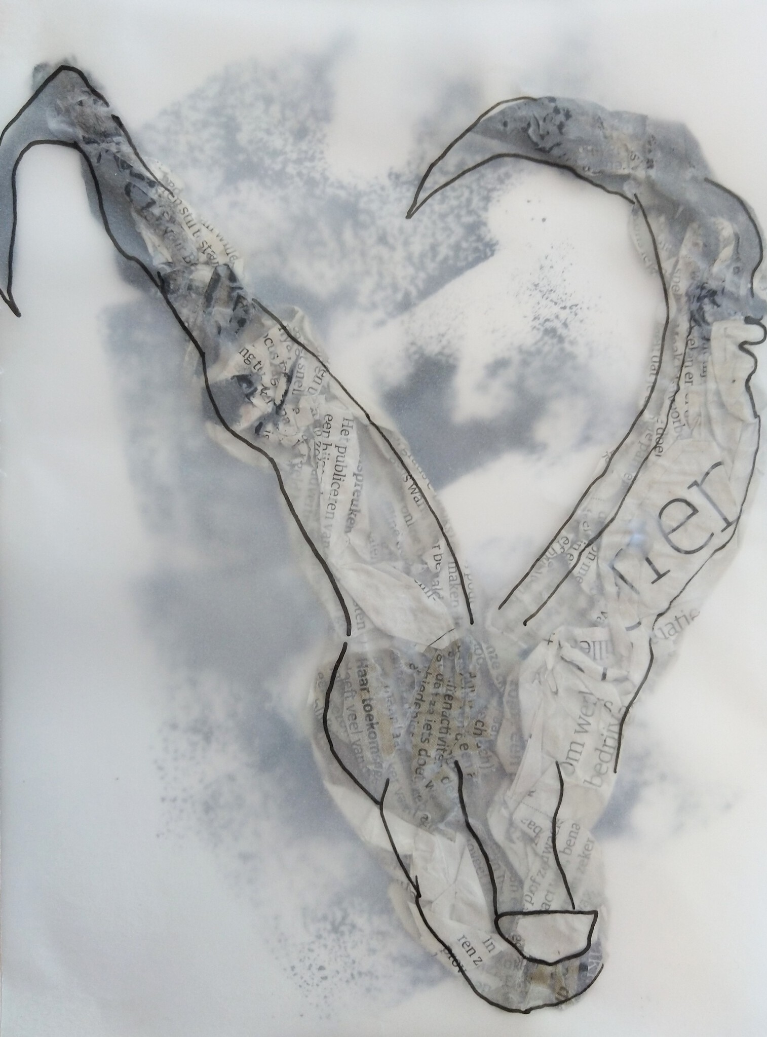 Steenbok/Capricornus. Gemengde technieken. Kranten, water, verf, inkt, fineliner. Achter transparant papier.