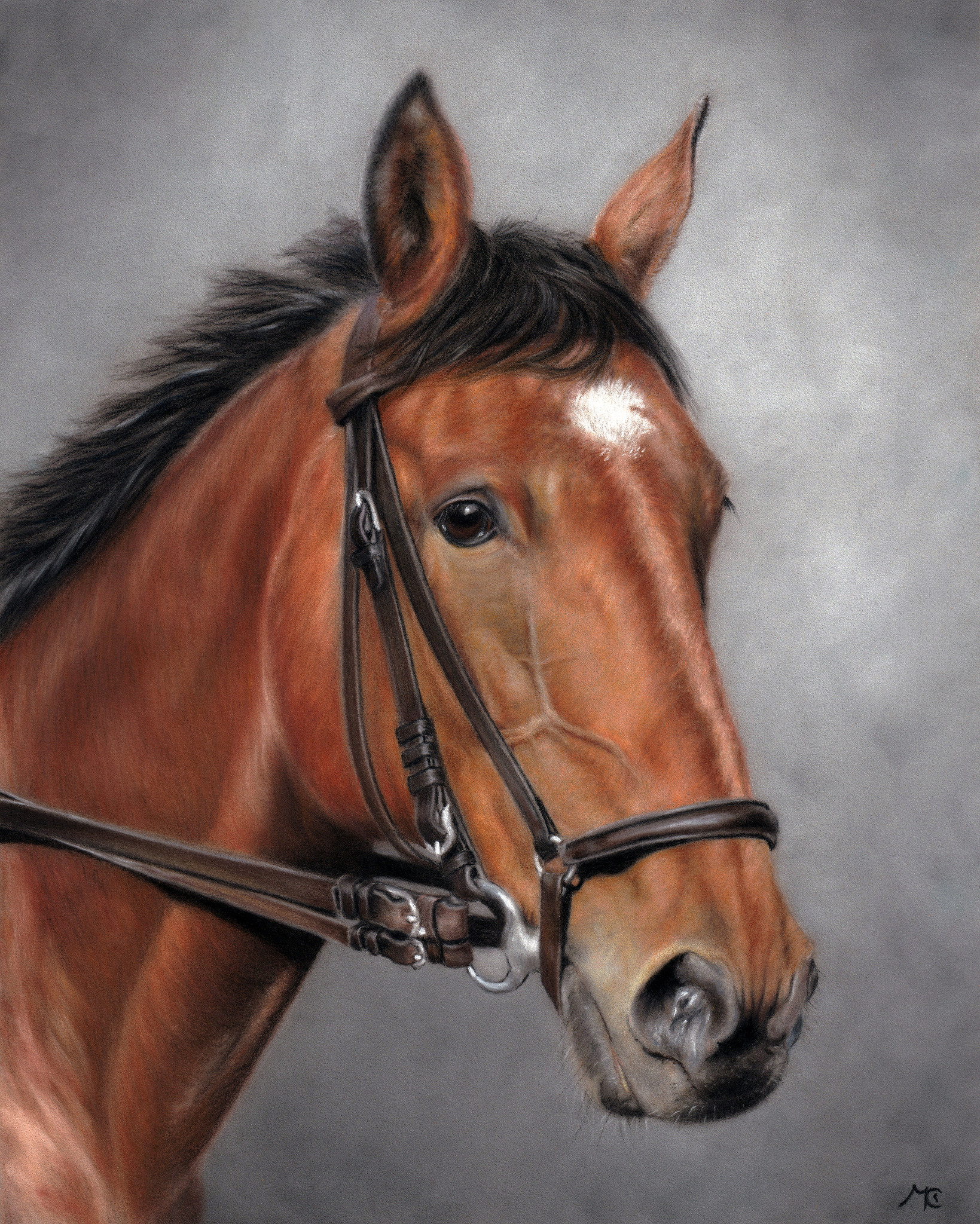 Portret in pastel van het prachtige paard Guinness. Gebruikte materialen: soft Pastel en Pastel potloden Formaat 24x30cm op Pastelmat, met Passe Partout 30x40cm