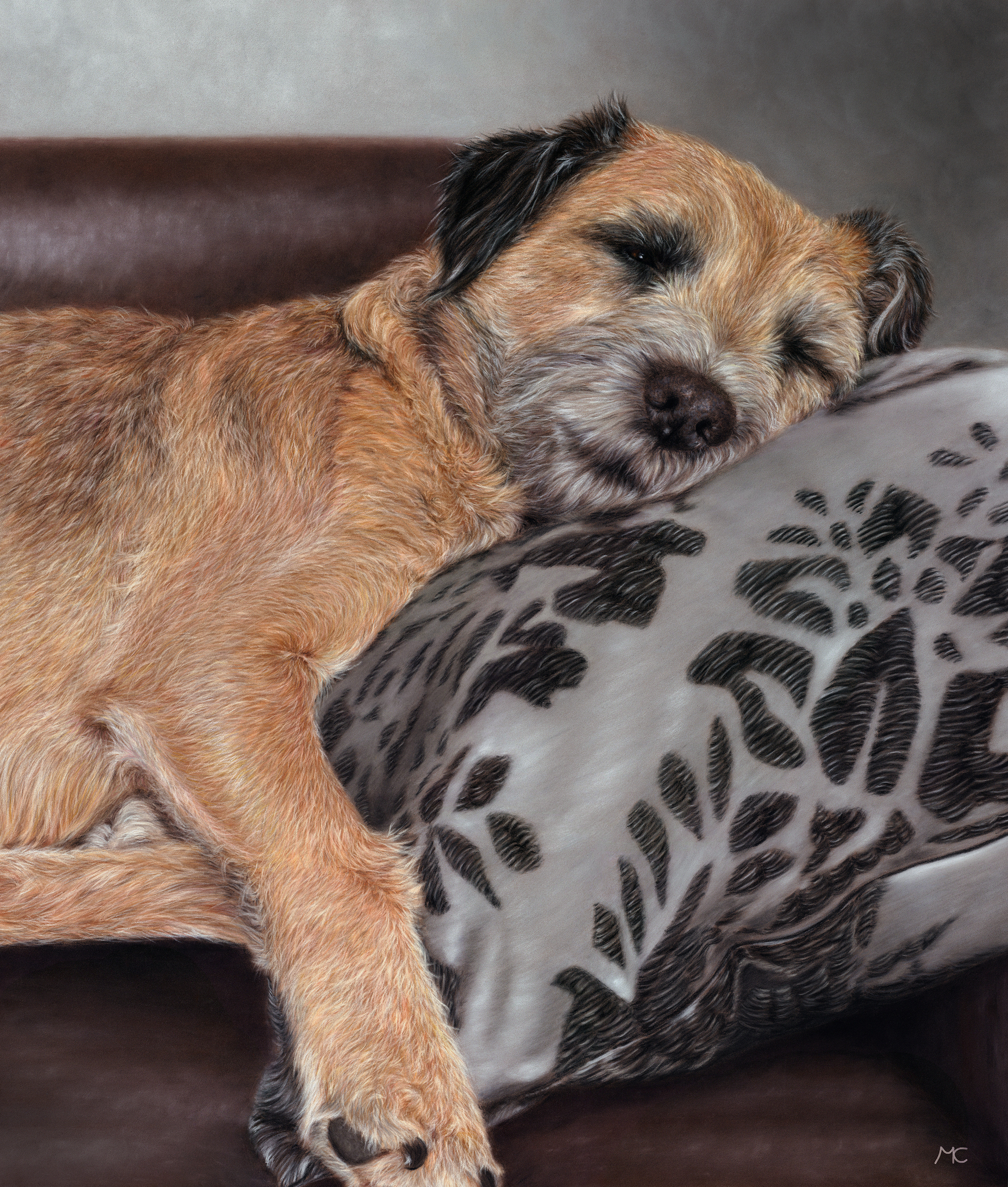 Levensgroot Pastel Portret van een Border Terrier (mijn eigen lieve luie huisgenootje) Gebruikte materialen: PanPastel, Soft Pastel krijt en Pastel potloden op Pastelmat 50x60cm.
