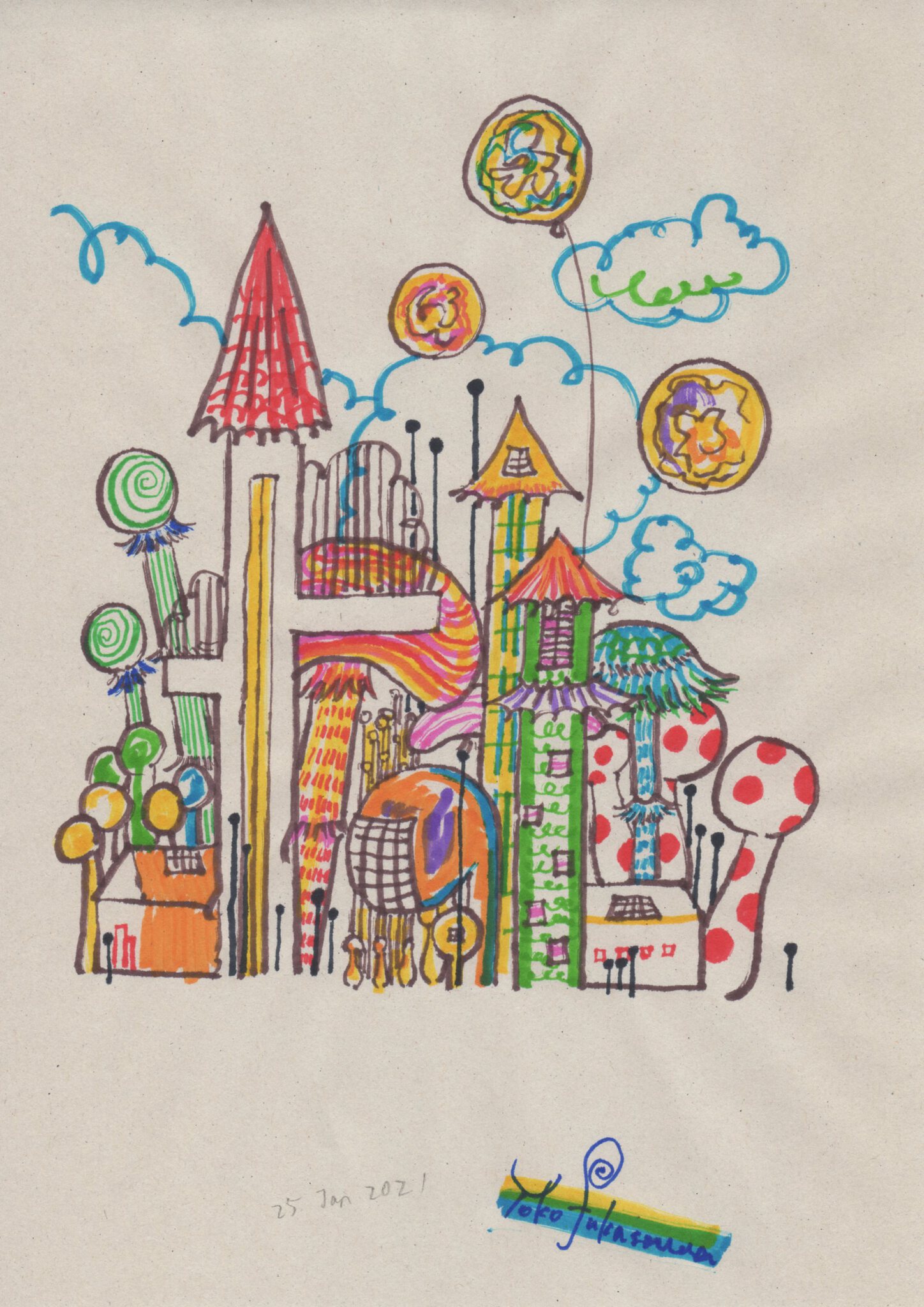 Yoko Fukasawa was born in 1982. 2001-Japan traditional craft department,Metal crafts major 2001-Volkswagen new Beetle - art contest The third place. 2002-TOKYO DOME - Tableware festival Fine work. 2017-And Schizophrenia has been revealed. Her paintings are outsider art. They are characterized by simple shapes and bright colors. She wants you to look at them and relax.