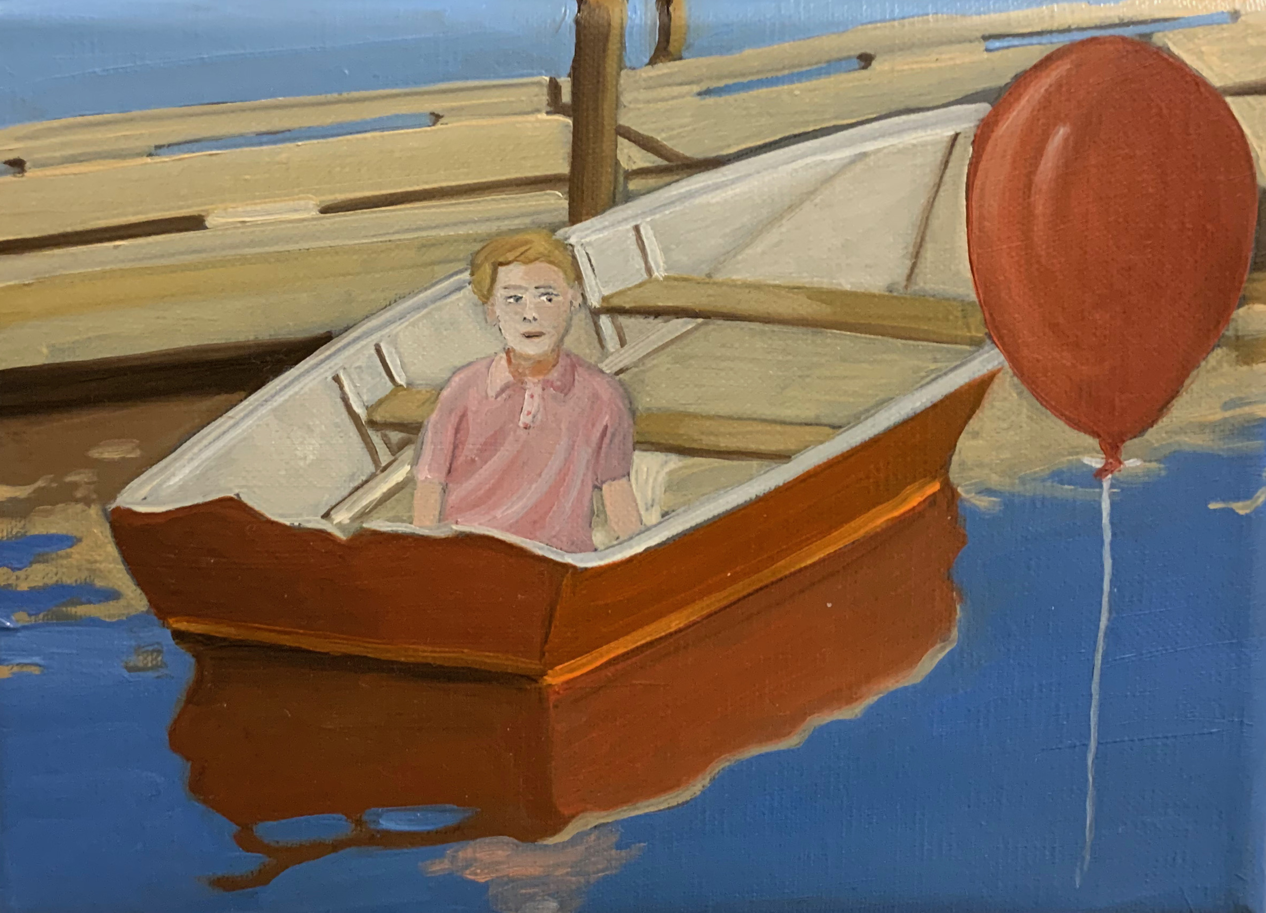 Een jongetje zit in een bootje. Gaat hij wat roeien of gewoon genieten op het water? Totaal onverwacht komt er echter een rode ballon op hem toegewaaid.