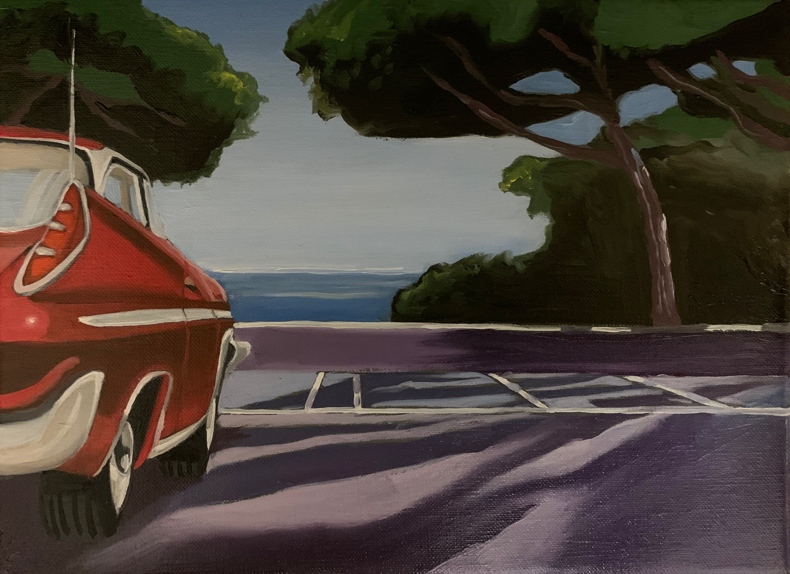 Een prachtige old timer staat geparkeerd met zicht op de zee. De azuurblauwe lucht en de schaduwrijke bomen verplaatsen ons direct naar Zuiderse oorden.