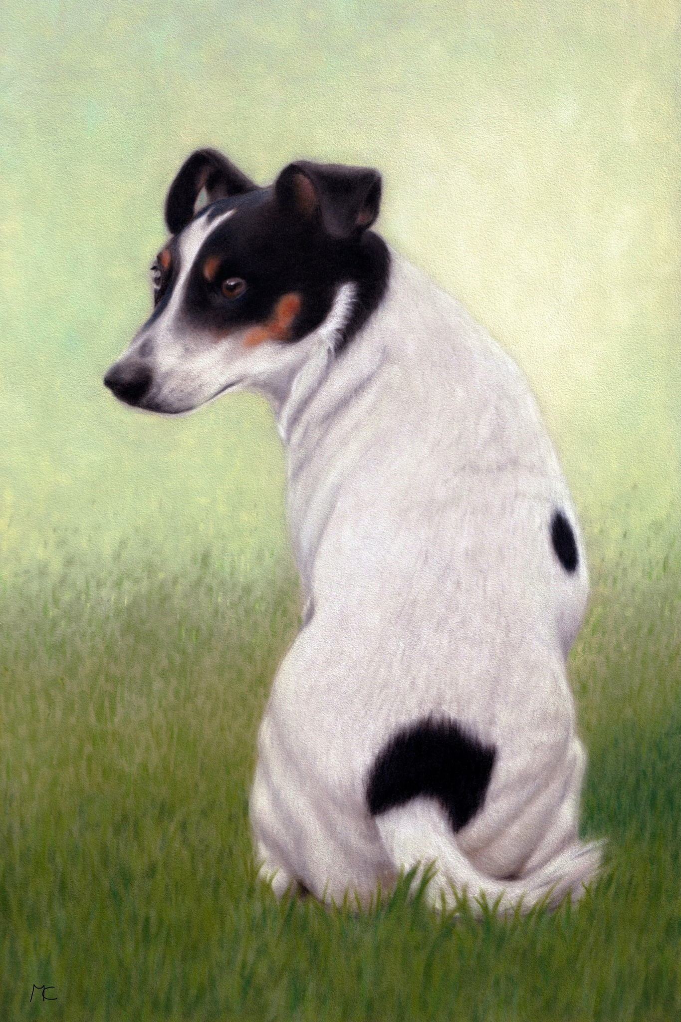 Pastel portret van een Jack Russel op suède karton Gebruikte materialen: Unison Soft Pastel krijt en diverse Pastel potloden op suède passe partout karton 20x30cm, inclusief Passe Partout 30x40cm