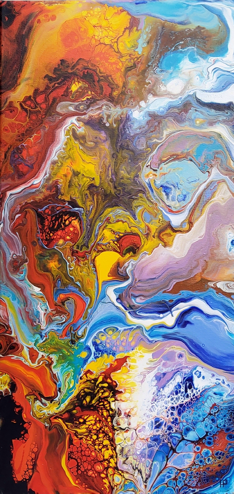 Het schilderij "Chaos 1" is een zeer kleurrijk abstract schilderij, met kleine fascinerende details. Als je langer naar het schilderij kijkt zie iedereen uiteenlopende objecten zoals dieren, landshcappen, organische vormen en sommigen zien zelfs buitenaardse wezentjes in de vloeiende bewegingen en de kleine details. Het schilderij is gemaakt met vloeibare acryl. Het is geschilderd op een katoenen Artel doek van 40x80cm. De zijkanten zijn ook beschilderd. Direct op te hangen.