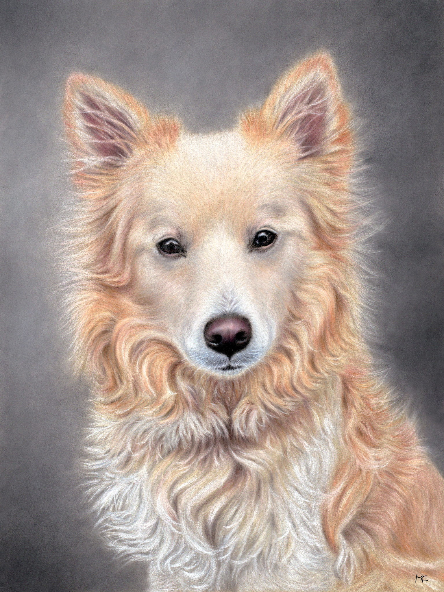 Pastel Portret in opdracht van een mix Keeshond/Sheltie Gebruikte materialen: PanPastel, Unison Soft Pastel en Diverse merken pastelpotloden op Pastelmat 30x40cm, inclusief Passe Partout