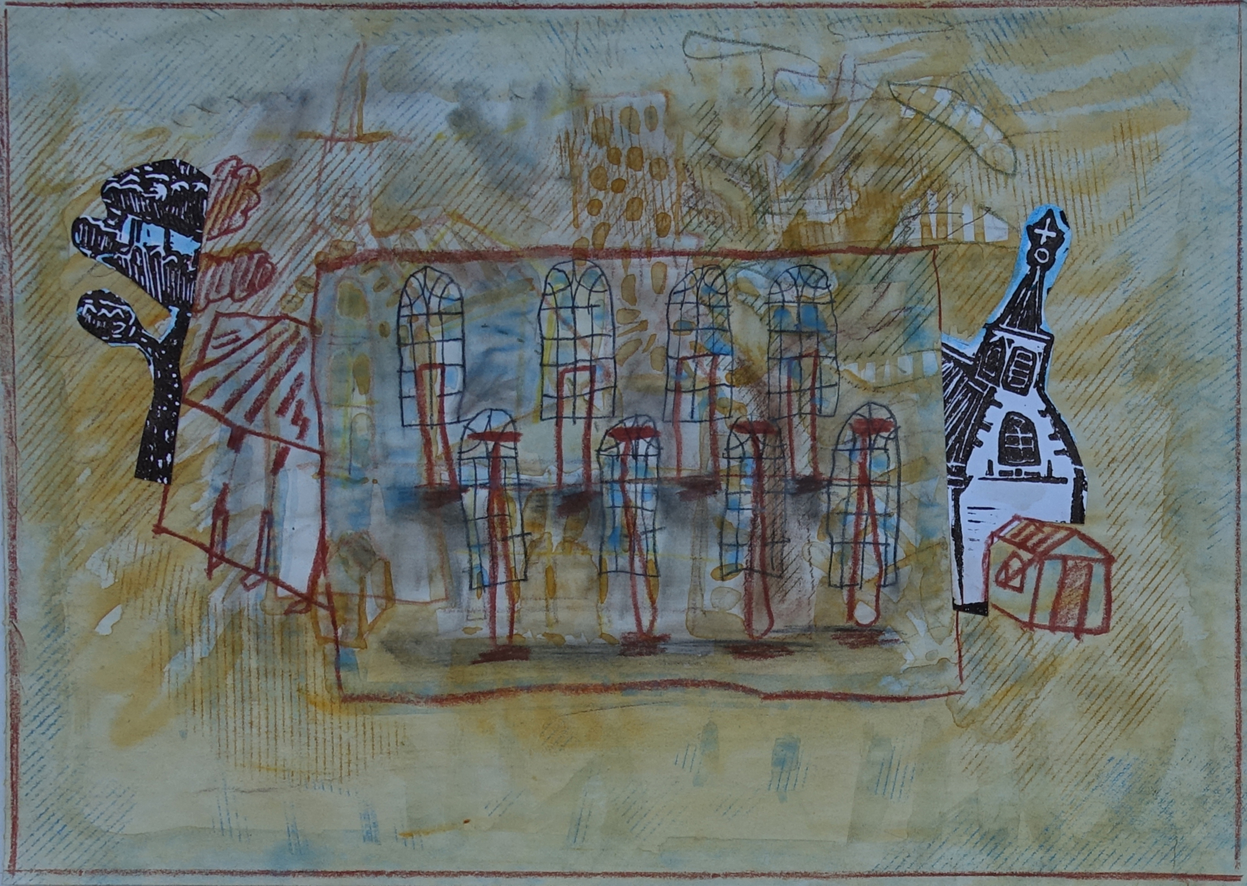 Naar binnen kijken, valt niet mee bij een kerk. De ramen zijn te hoog. Nieuwsgierigheid naar de werking van het licht binnen, deed me dit werkje maken. Een grote lichte ruimte, die zijn bestaan vanaf de buitenkant laat raden.