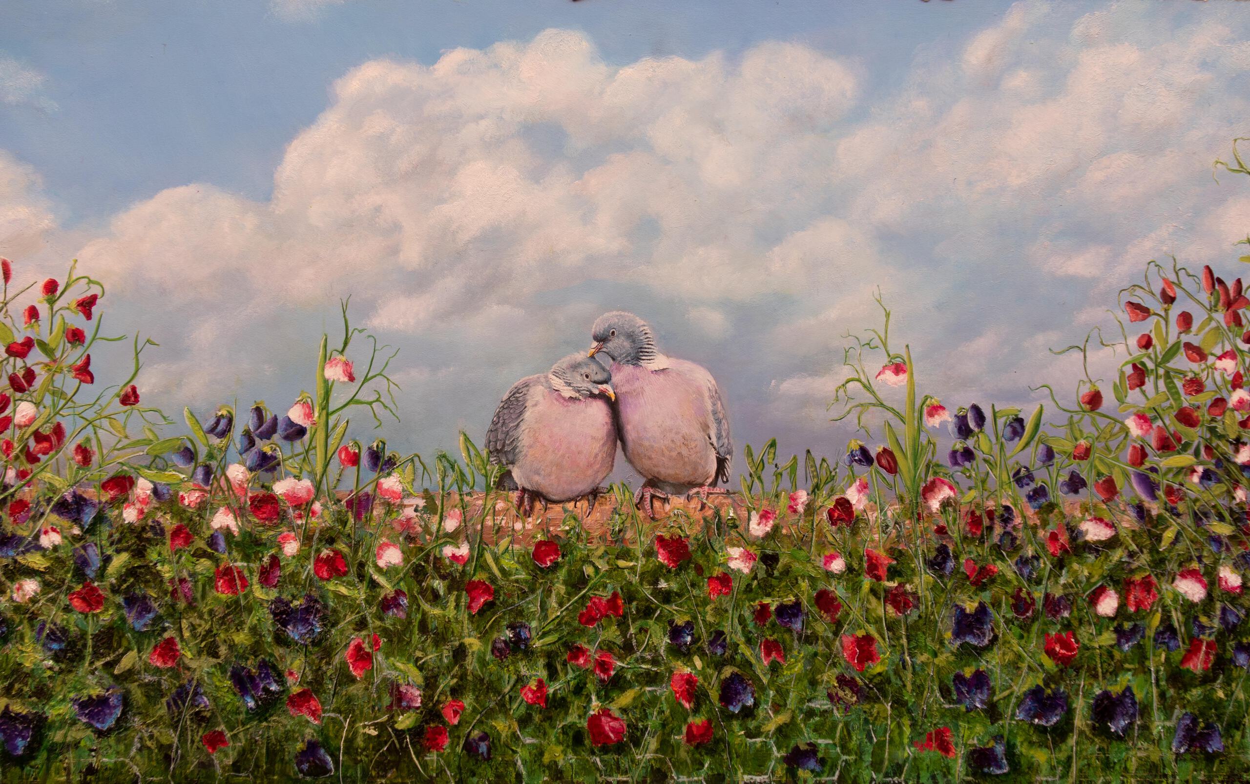 Houtduiven op een landhek omgeven door lathyrussen. De duif staat symbool voor de liefde en trouw maar ook voor de vrede.