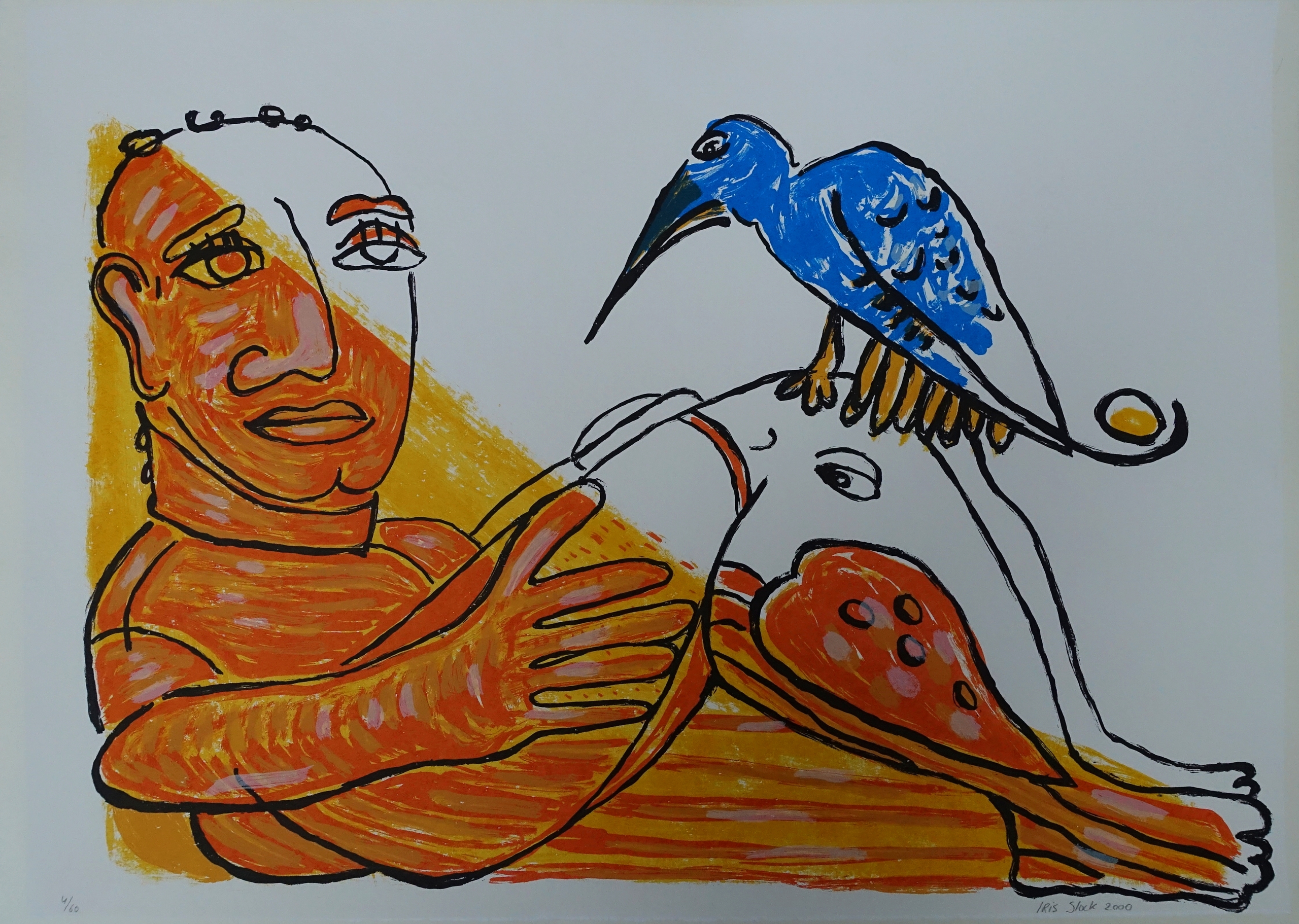 Een zittende persoon met twee vogels. Zijn onderbeen vormt ook een vogel. 60 stuks gedrukt, Ik heb nog 11 over
