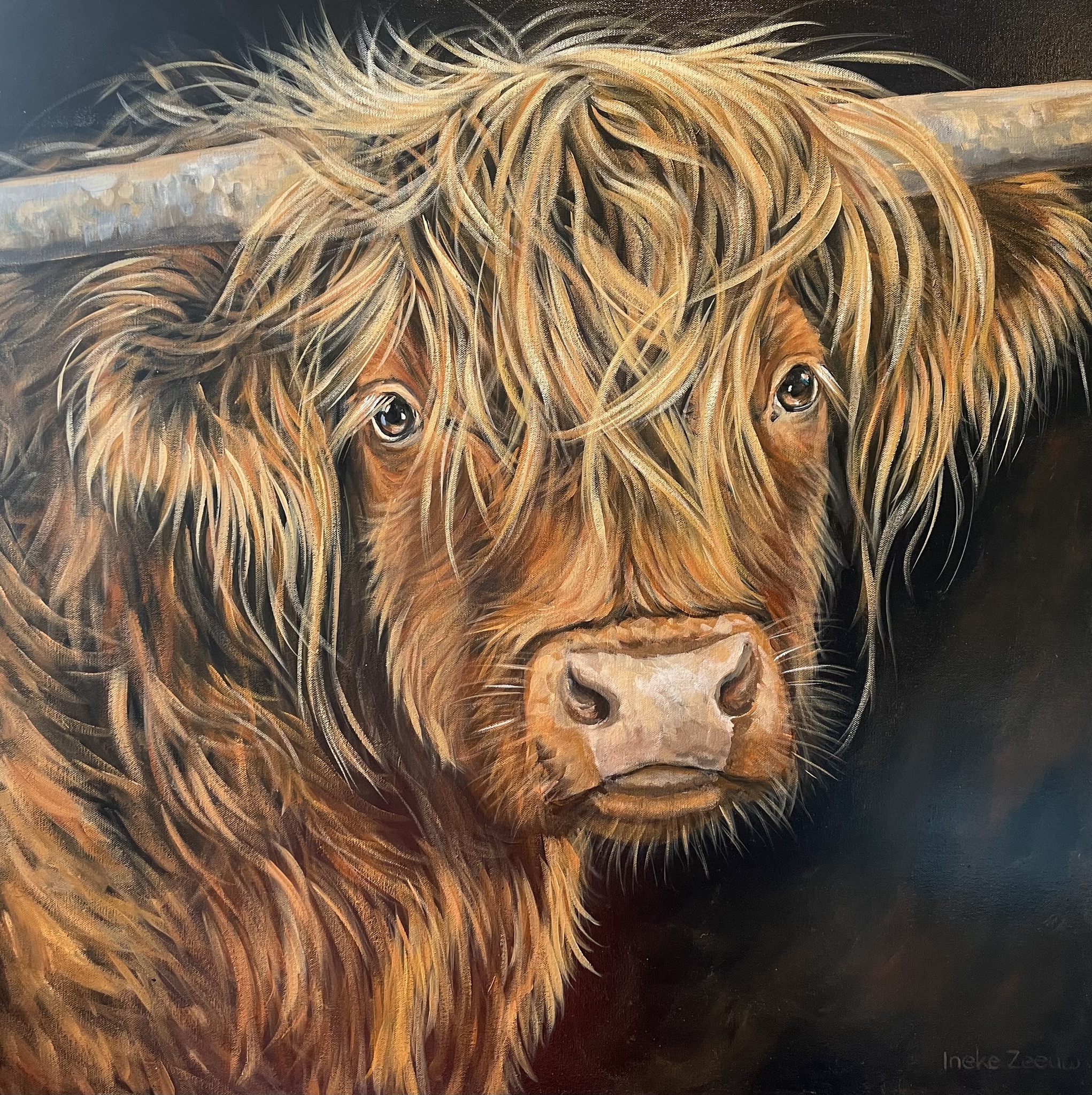 Schilderij Zwart Bruin Kop Hooglander Koe Acrylverf Donker Schotse Klassiek Landelijk