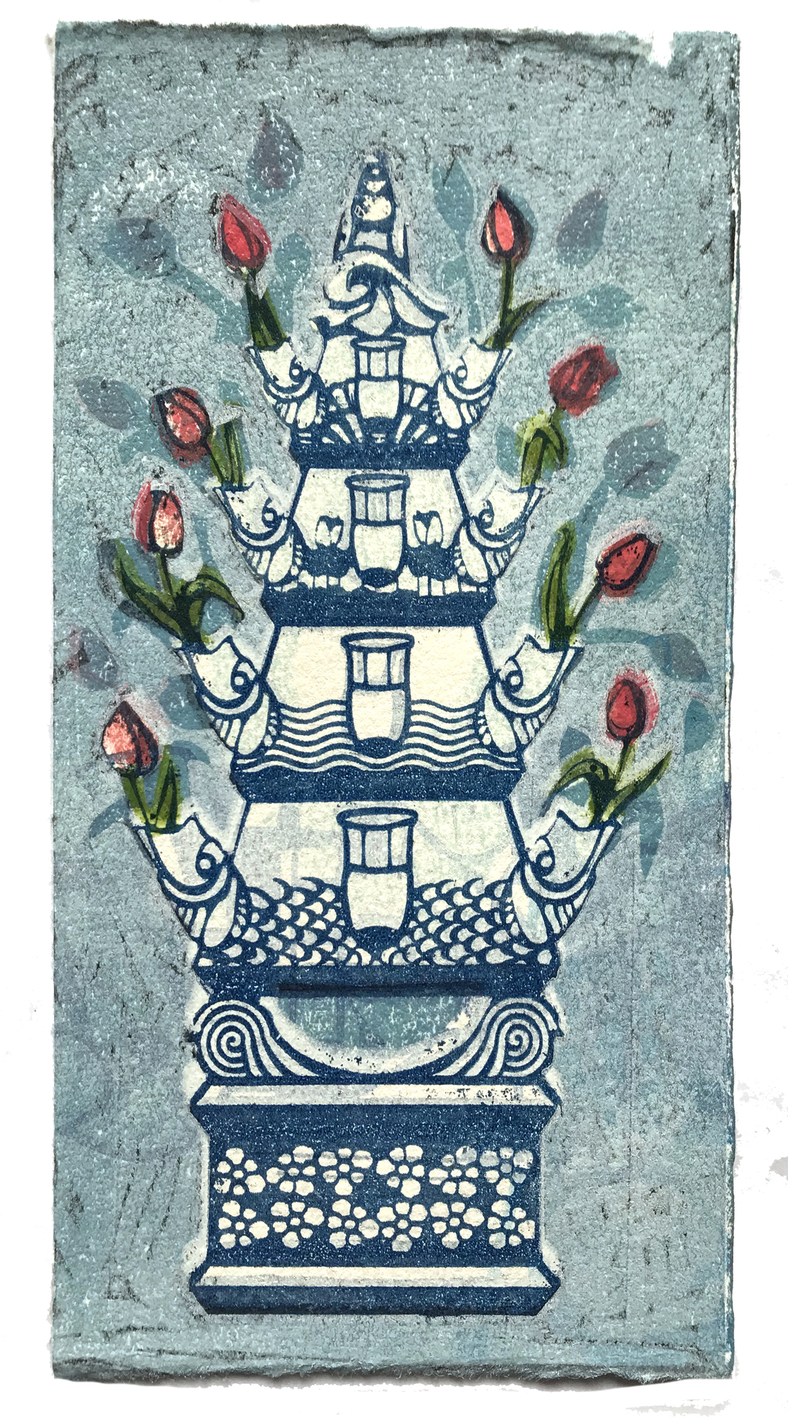 Een serie mini hoogdruk monotypes rond tulpenvazen.