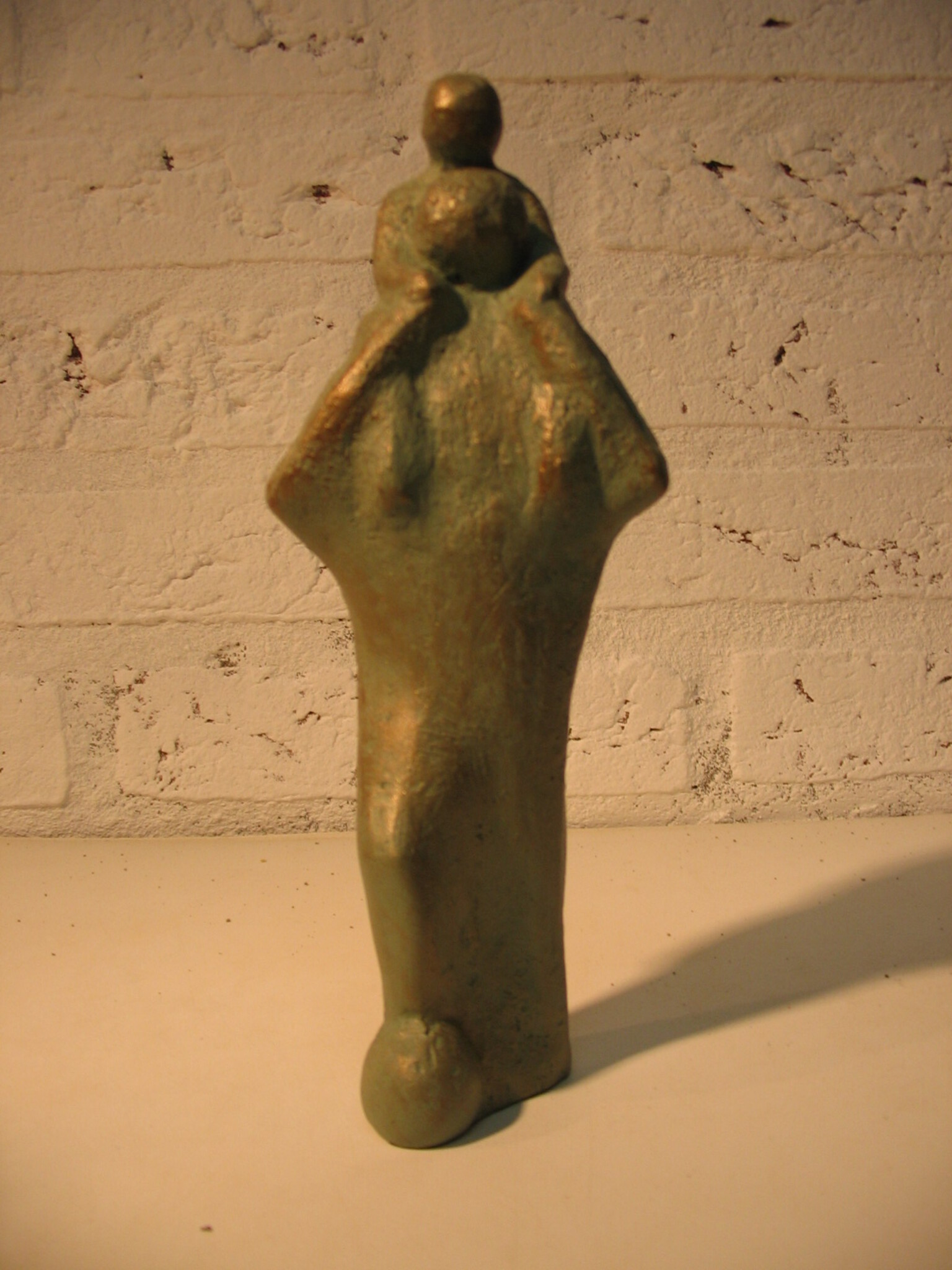 Voetbalvader met zoon op zijn schouder. Uitgevoerd in gegoten Neolith met groene acryl en bronscoating.
