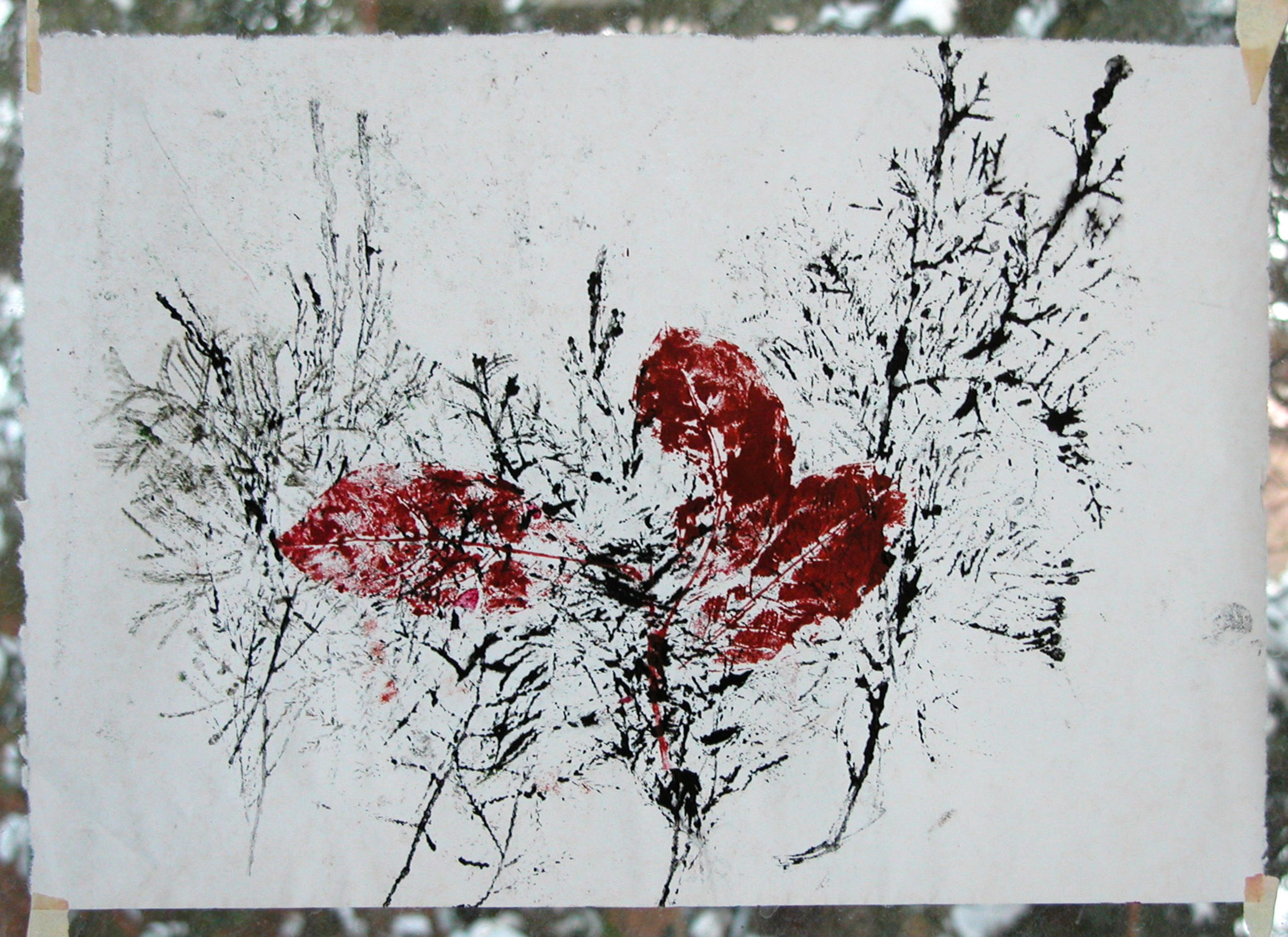 Op semitransparant rijstpapier afgedrukte plantresten (monoprint). Dit is er één uit een serie kleine monoprints.