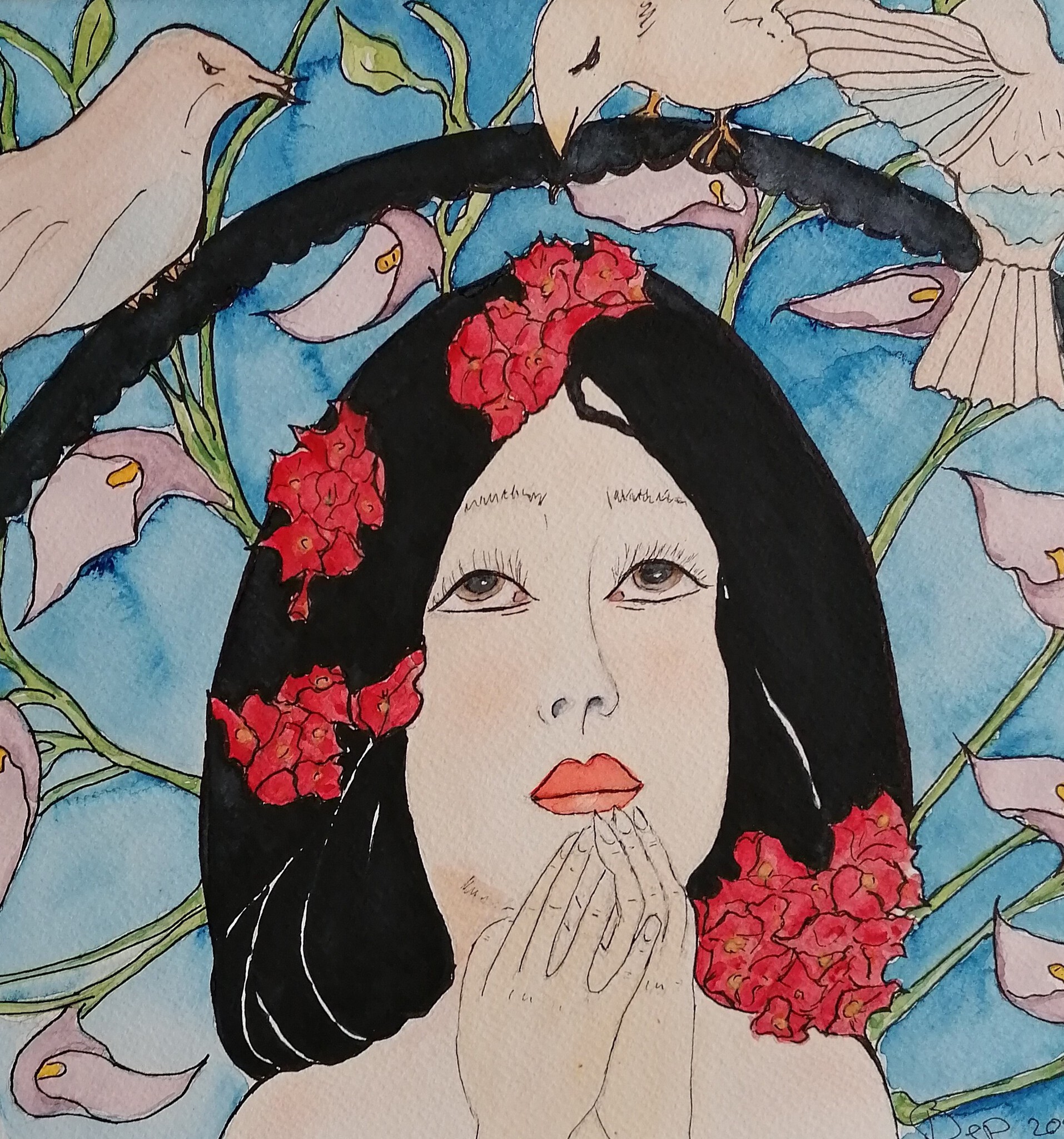 Bloemen Vrouw Art Aquarel Vogels Deco