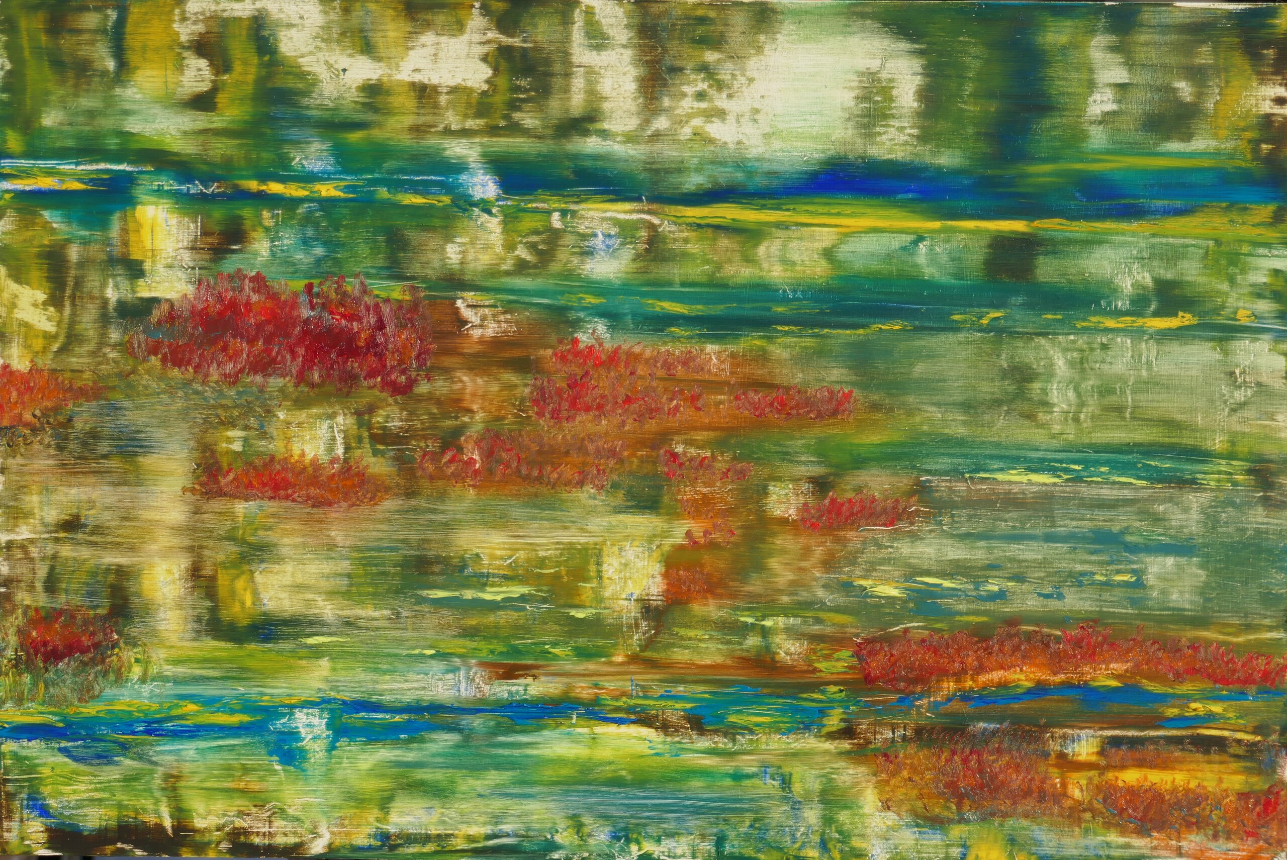 Geabstraheerd landschap. Het werk zit in een houten baklijst.