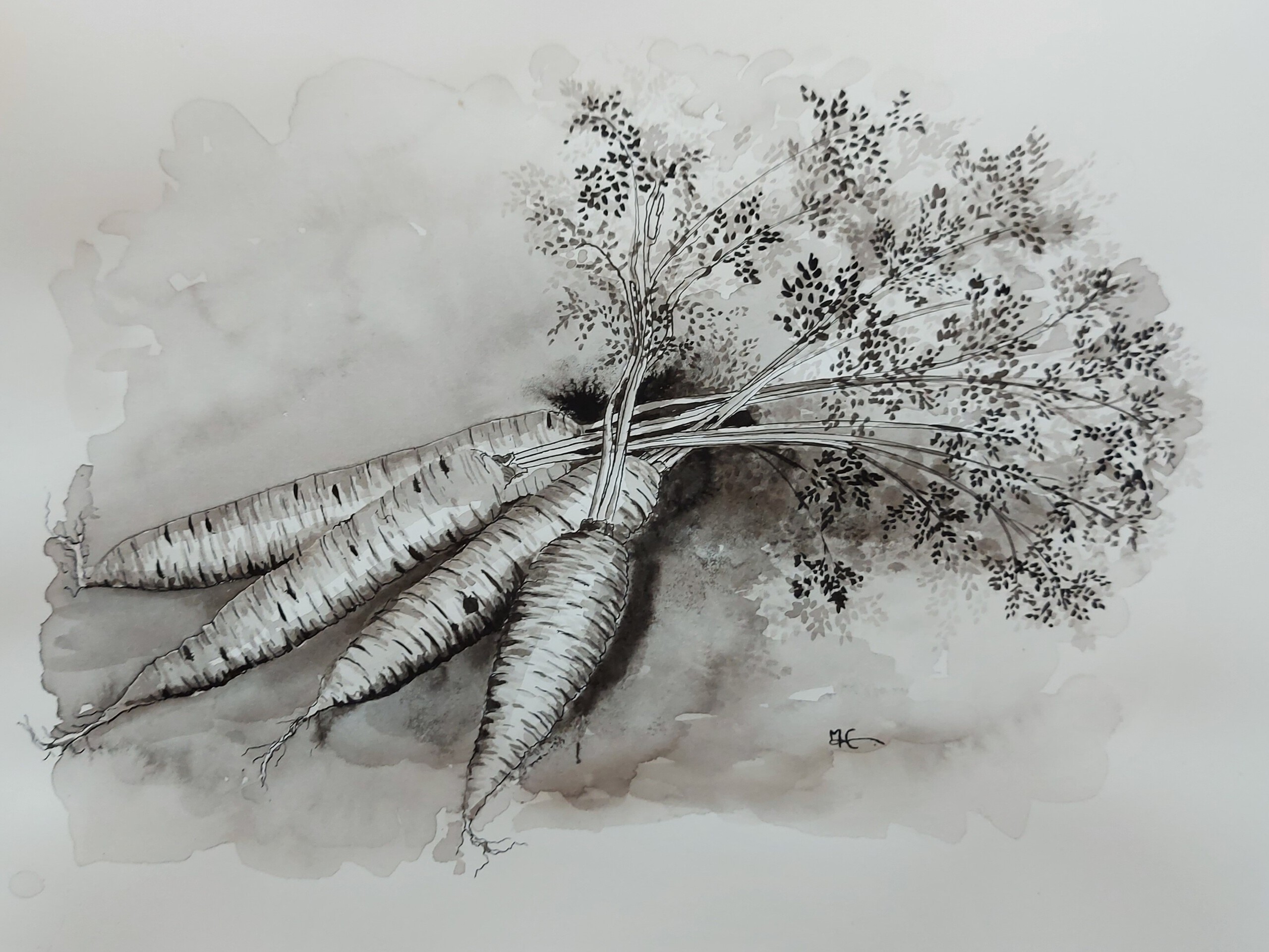 Stilleven met wortels. Studie in Oost-Indische inkt.