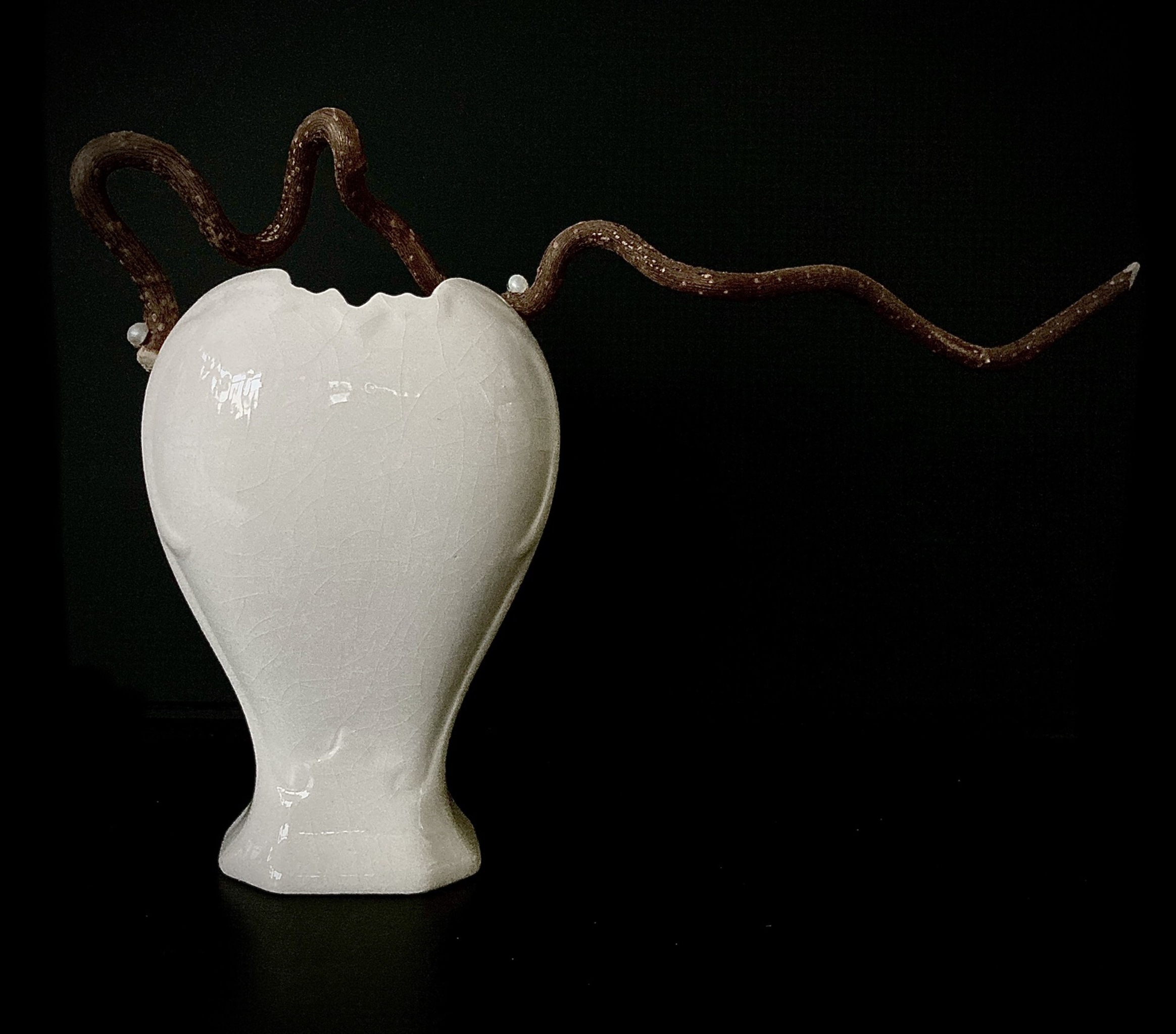 Vaasje 2 Een vaasje gemaakt met porselein klei in een zelfgemaakte gietmal. Aan het vaasje is een prachtige tak bevestigd. De combinatie van hout en keramiek vind ik prachtig. Dit vaasje is nr 2 van een groep vaasjes van dezelfde gietmal steeds op een andere manier gemaakt.