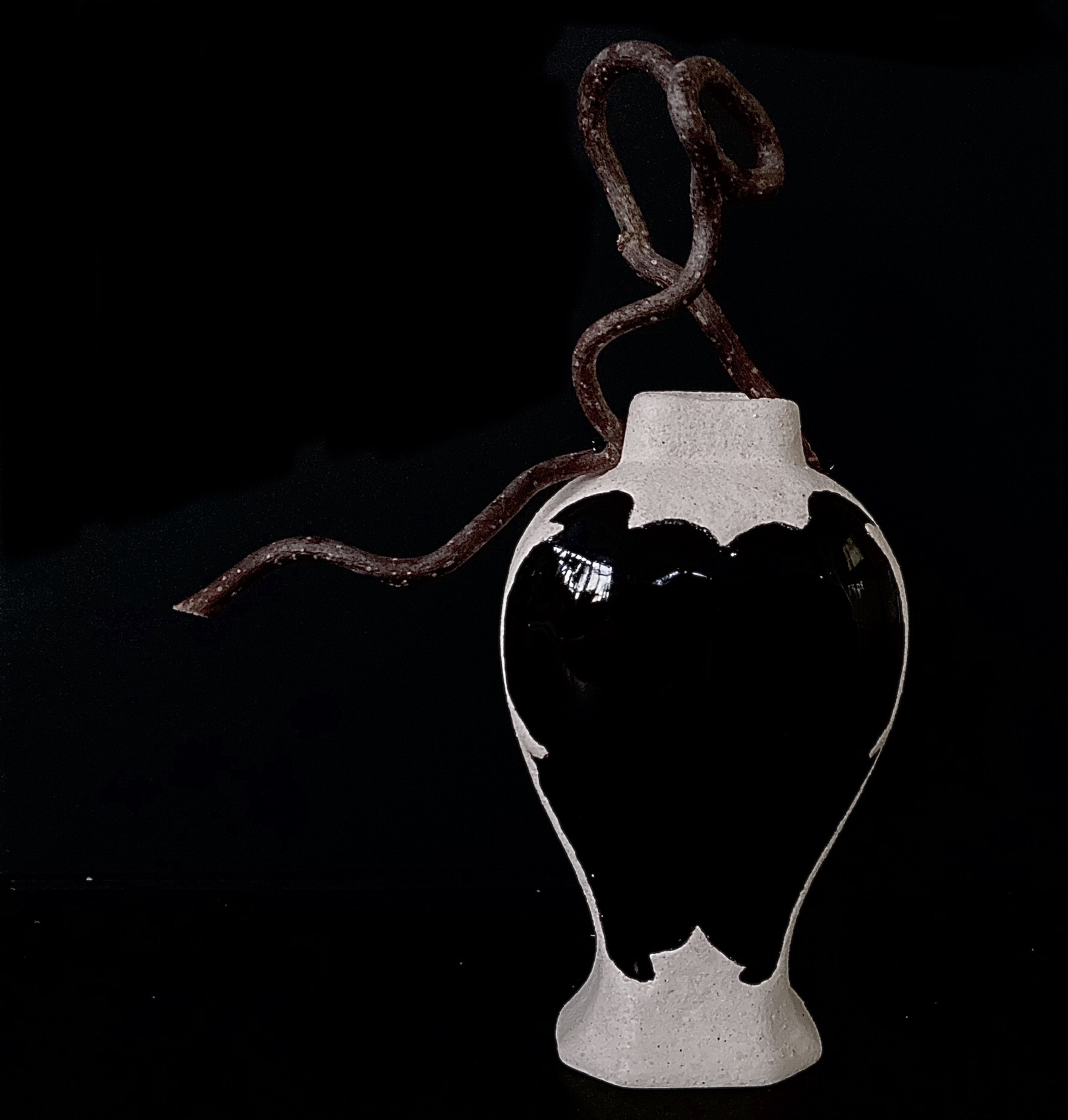 Vaasje 3 Een vaasje gemaakt met porselein klei in een zelfgemaakte gietmal. Het motief is in een contrasterende kleur geglazuurd en aan het vaasje is een prachtige tak bevestigd. De combinatie van hout en keramiek vind ik prachtig. Dit vaasje is nr 3 van een groep vaasjes van dezelfde gietmal steeds op een andere manier gemaakt.