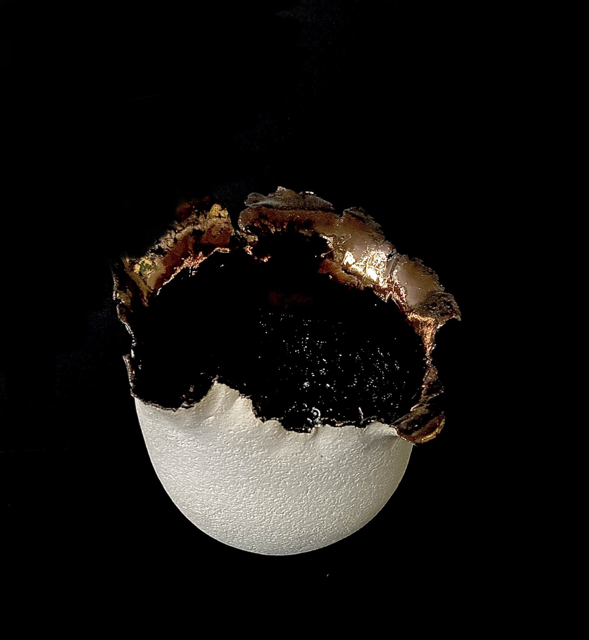 Vanuit een bolvorm die opengescheurd is, zie je gouden gloed stralen. Helemaal wanneer het waxinekaarsje brand.