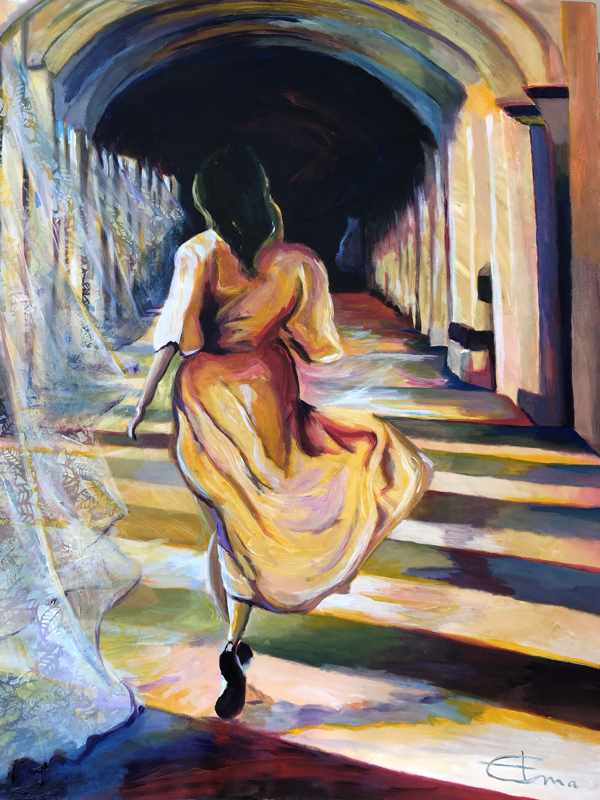 Schilderij Acryl Vrouw Licht Donker Kleur Gordijn Lopen Ergens
