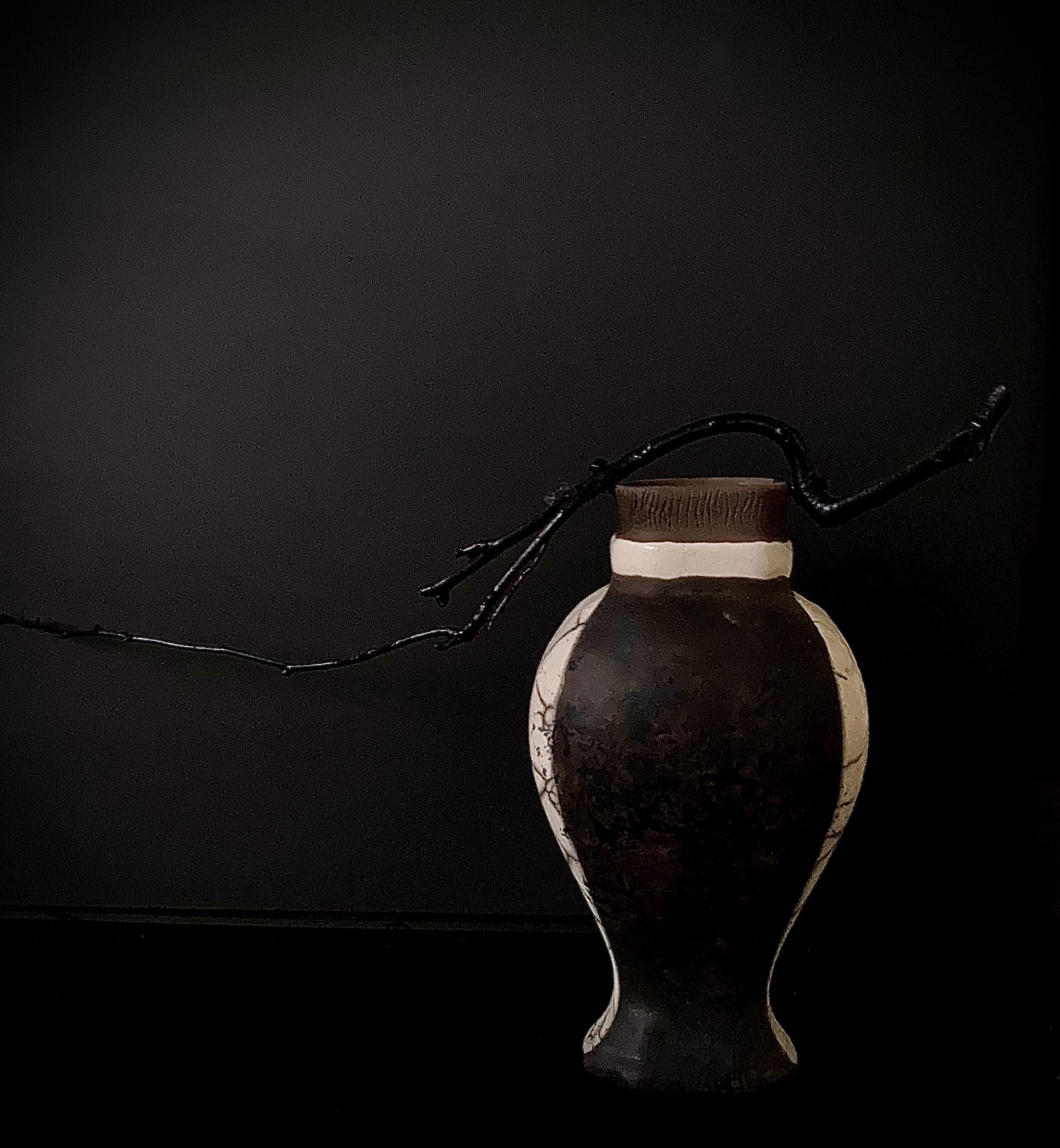 Een vaasje gemaakt met porselein klei in een zelfgemaakte gietmal. Aan het vaasje is een prachtige tak bevestigd. De combinatie van hout en keramiek vind ik prachtig. Dit vaasje is nr 6 van een groep vaasjes van dezelfde gietmal steeds op een andere manier gemaakt. Dit vaasje is in de rakustook gegaan.