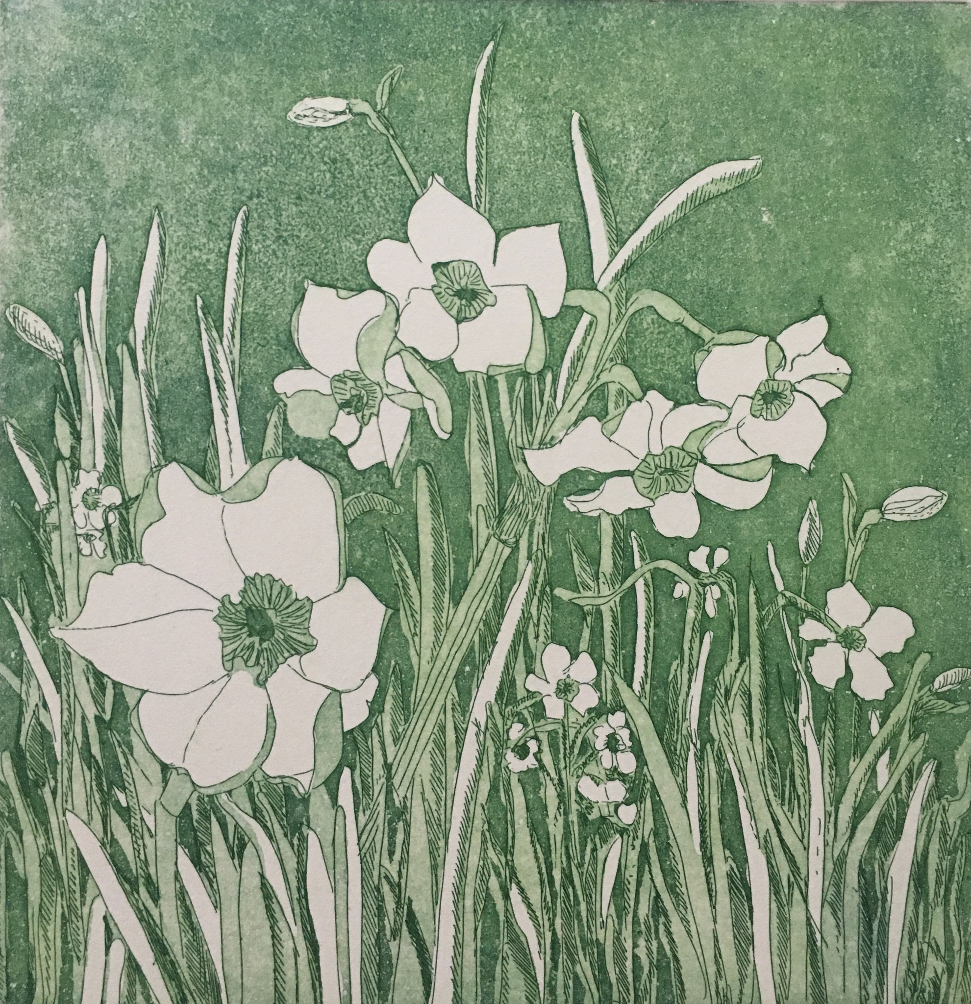 Bloemen Ets Aquatint Lijnets Challenge Narcissen Diepdruk Groen