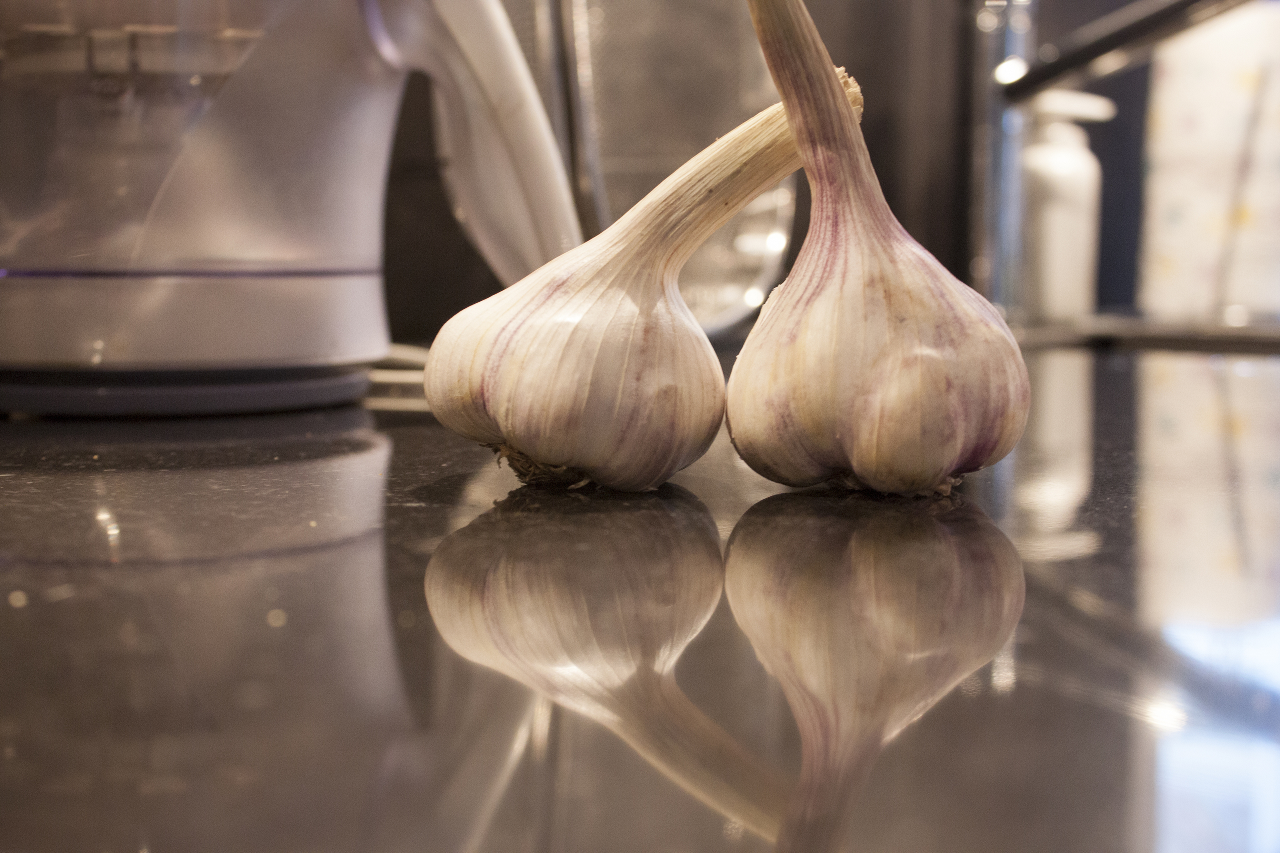 twee knoflook bollen op het aanrecht