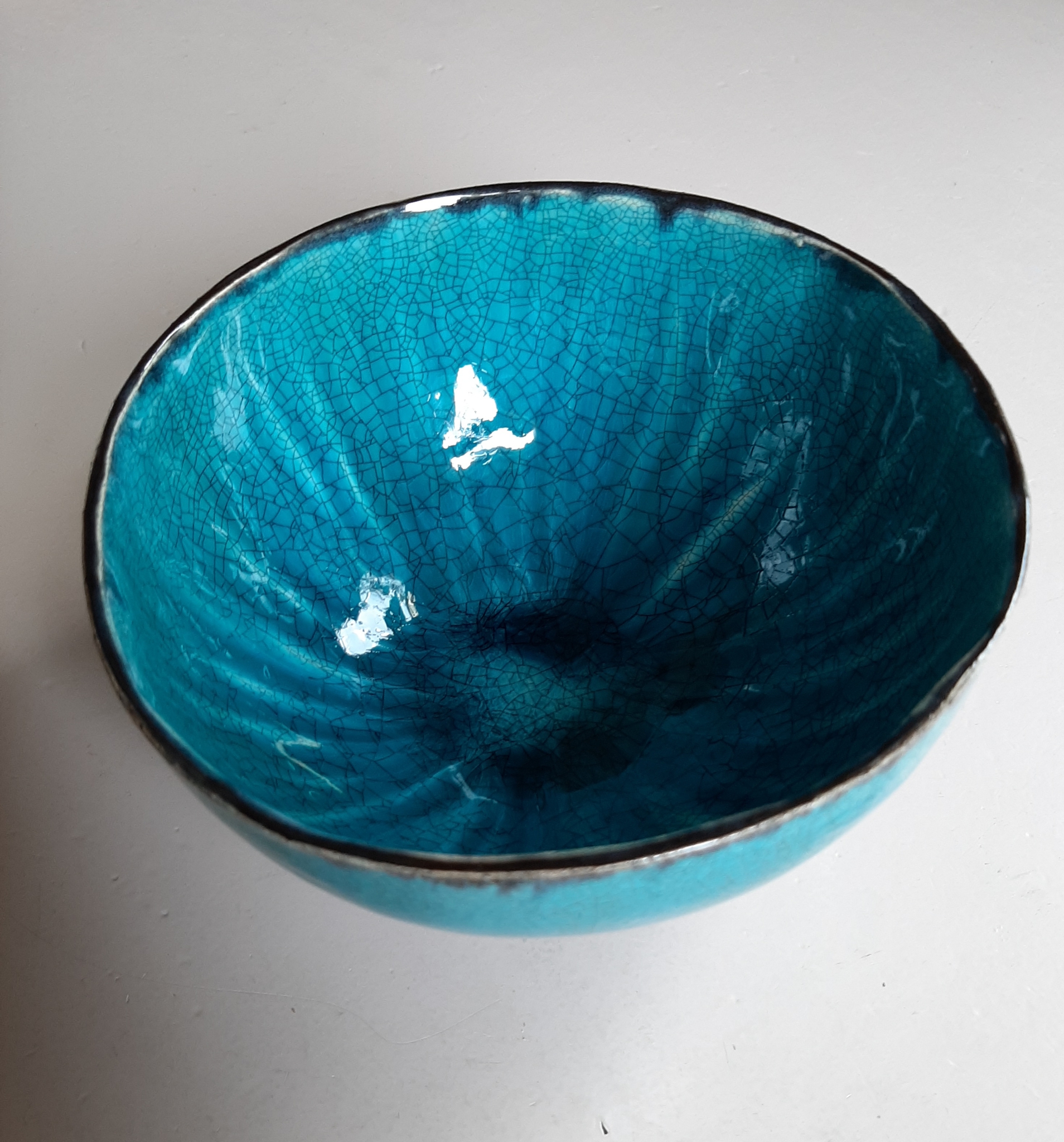Aardewerk, craquelé glazuur met ingewassen Oostindische inkt. De kom heeft een klein voetje. Deze kom is verkocht maar is op aanvraag opnieuw te maken. Levertijd 5 weken.