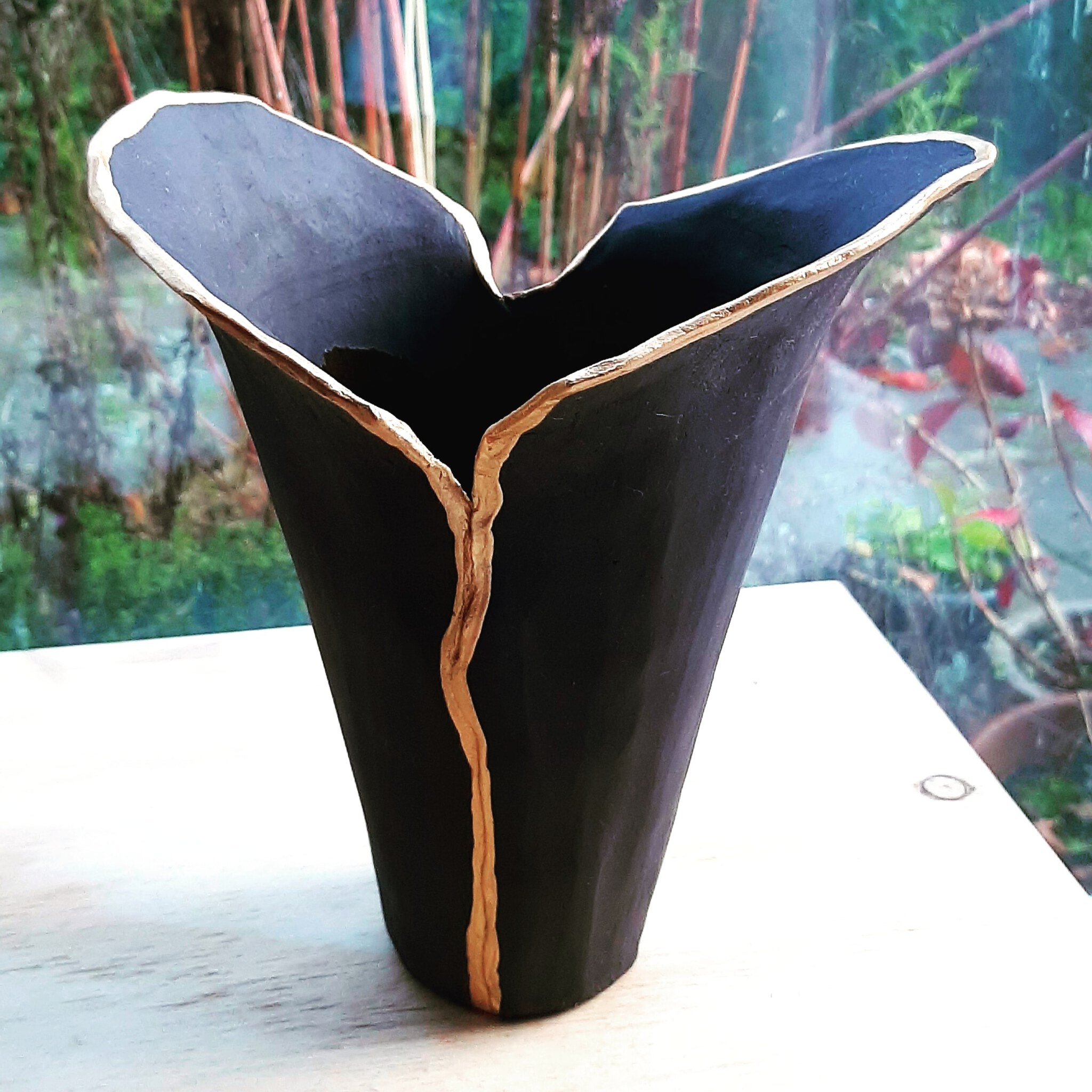 Steengoed. Zwarte klei met rand van goudverf. Kan in opdracht gemaakt worden, levertijd 5 weken