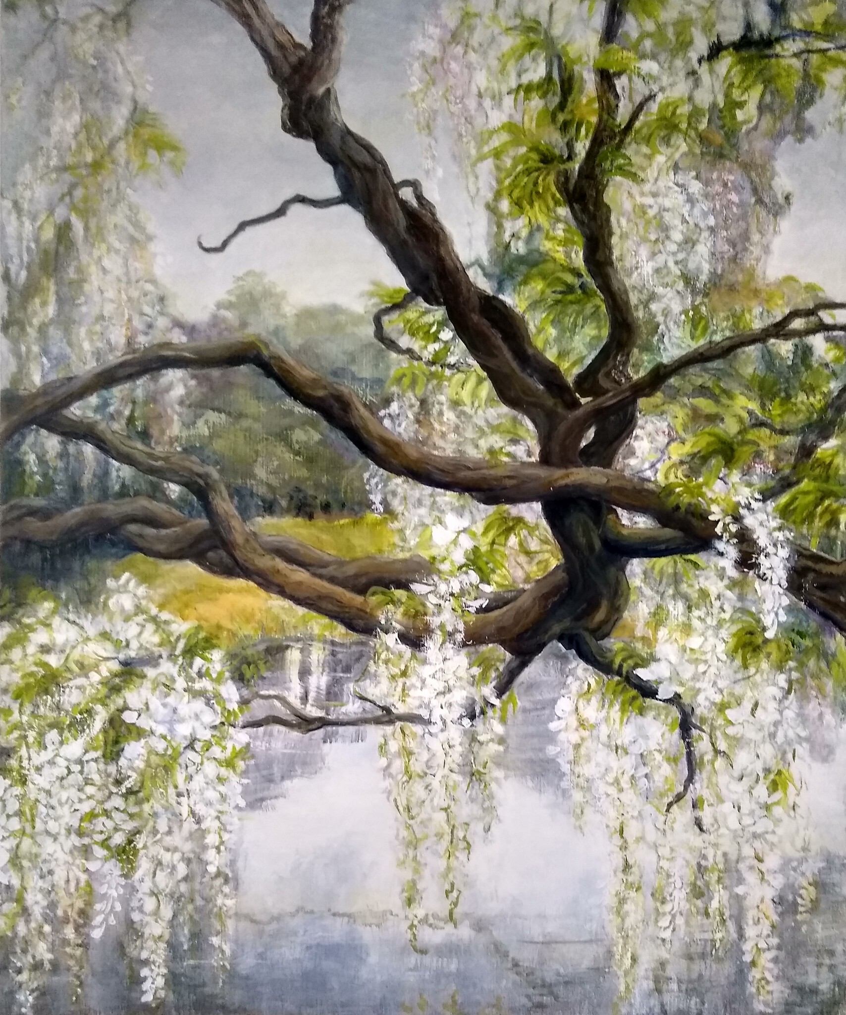 Het prachtige contrast van de knoestige en toch sierlijke takken met de ijle bloemtrossen blijft me altijd boeien.