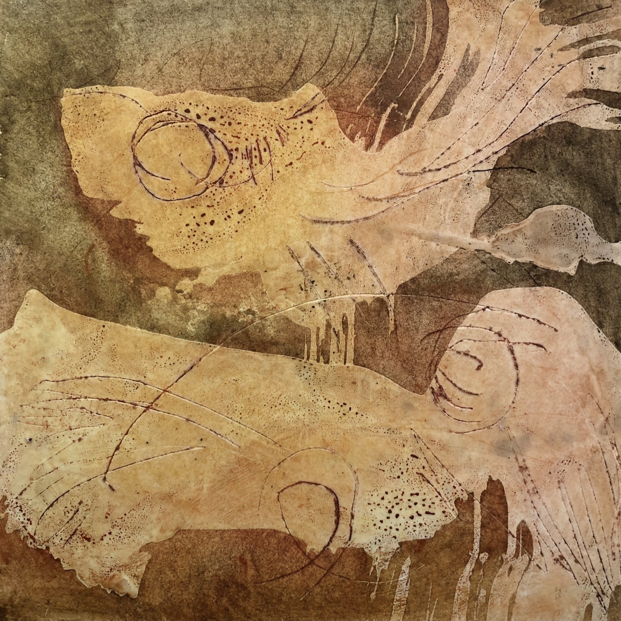 In mijn werk maak ik gebruik van gemengde technieken en werk ik graag in lagen, al dan niet gebruikmakend van textuur. Ik houd ervan om onderlagen weer zichtbaar te maken en weer nieuwe lagen toe te voegen. Al doende groeit het beeld onder mij handen, letterlijk, omdat ik graag met mijn handen werk om te bereiken wat ik wil.