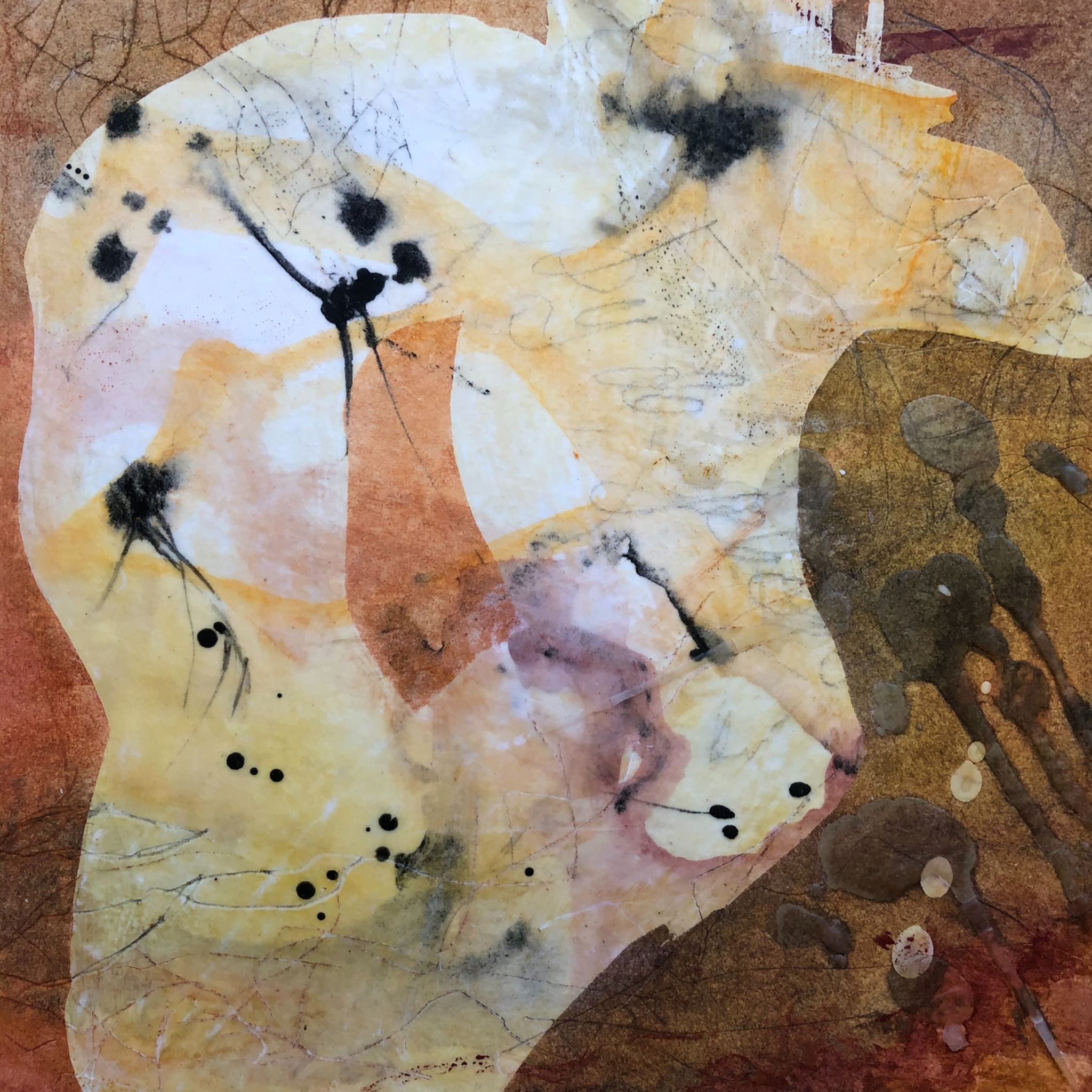 In mijn werk maak ik gebruik van gemengde technieken en werk ik graag in lagen, al dan niet gebruikmakend van textuur. Ik houd ervan om onderlagen weer zichtbaar te maken en weer nieuwe lagen toe te voegen. Al doende groeit het beeld onder mij handen, letterlijk, omdat ik graag met mijn handen werk om te bereiken wat ik wil.