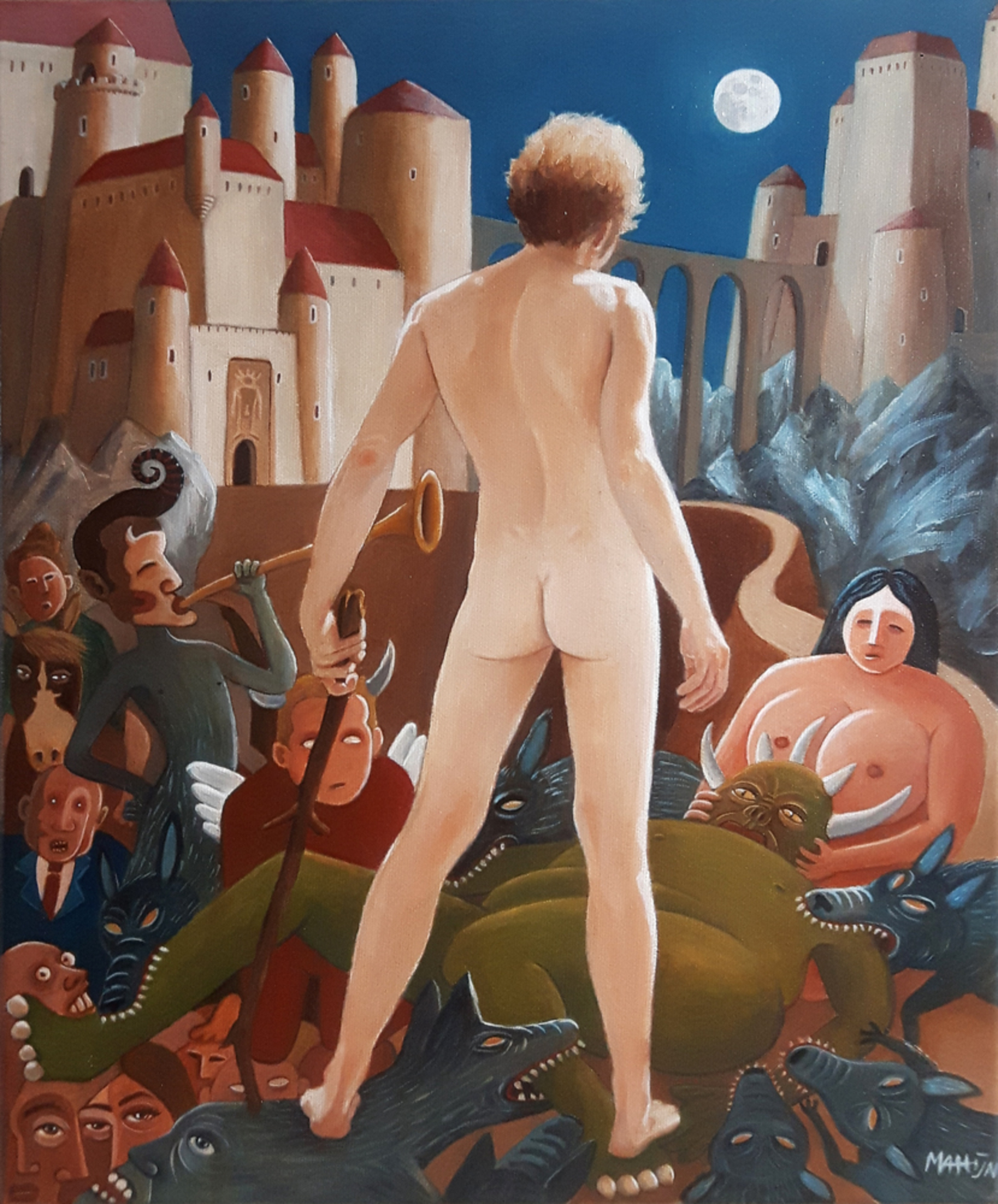 Ik maak olieverfschilderijen, illustraties fotomontages en video's , in een (magisch) realistische en absurde stijl.