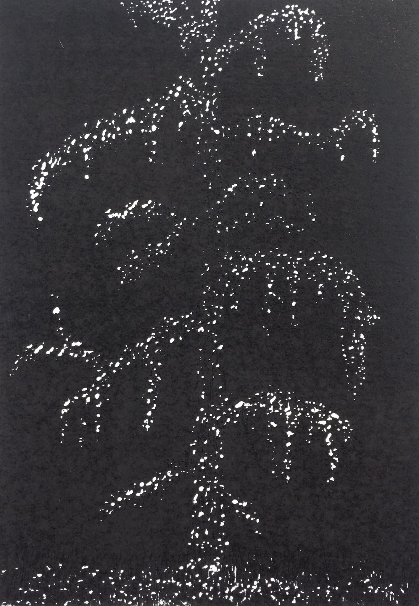 het werk Larix is een ode aan Hercules Segers, die een werk met de titel bemoste Larix heeft gemaakt. Hij was de eerste nederlander die een kleurendruk maakte en ook experimenteerde met de grafische technieken. Dat heb ik ook gedaan. Deze afbeelding is niet uitgestoken met gutsen, maar met behulp van tandartsboortjes uit de linoleum geboord en vervolgens afgedrukt in hoogdruktechniek. Dezelfde afbeelding is ook gedrukt als ets en vind u terug in een andere groep van werken , bij de diversen.