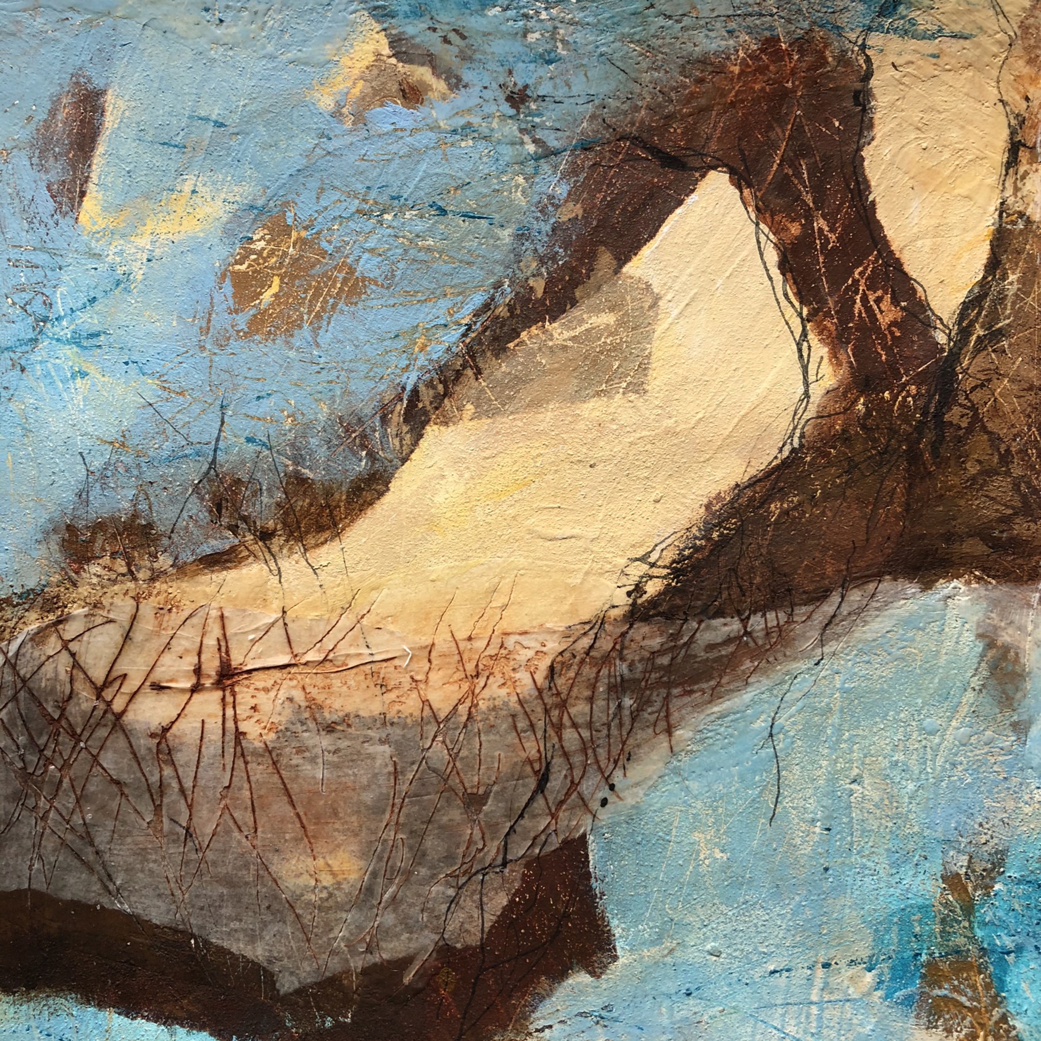 In mijn werk maak ik gebruik van gemengde technieken en werk ik graag in lagen, al dan niet gebruikmakend van textuur. Ik houd ervan om onderlagen weer zichtbaar te maken en weer nieuwe lagen toe te voegen. Al doende groeit het beeld onder mij handen, letterlijk, omdat ik graag met mijn handen werk om te bereiken wat ik wil.