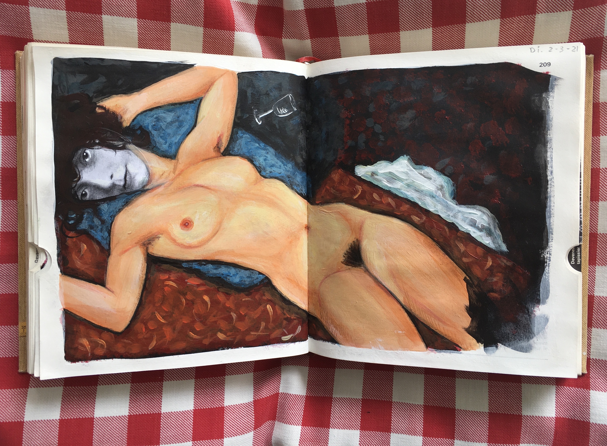 Painting after Modigliani with collaged face, in an old book.