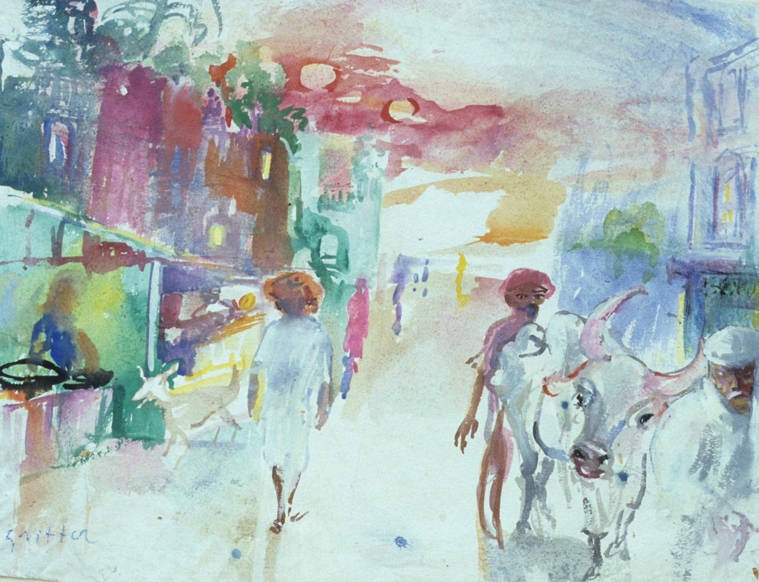 Op handgeschept zwaar Idiaas papier schilder ik een straatbeeld van Puskar dat toen typerend was.