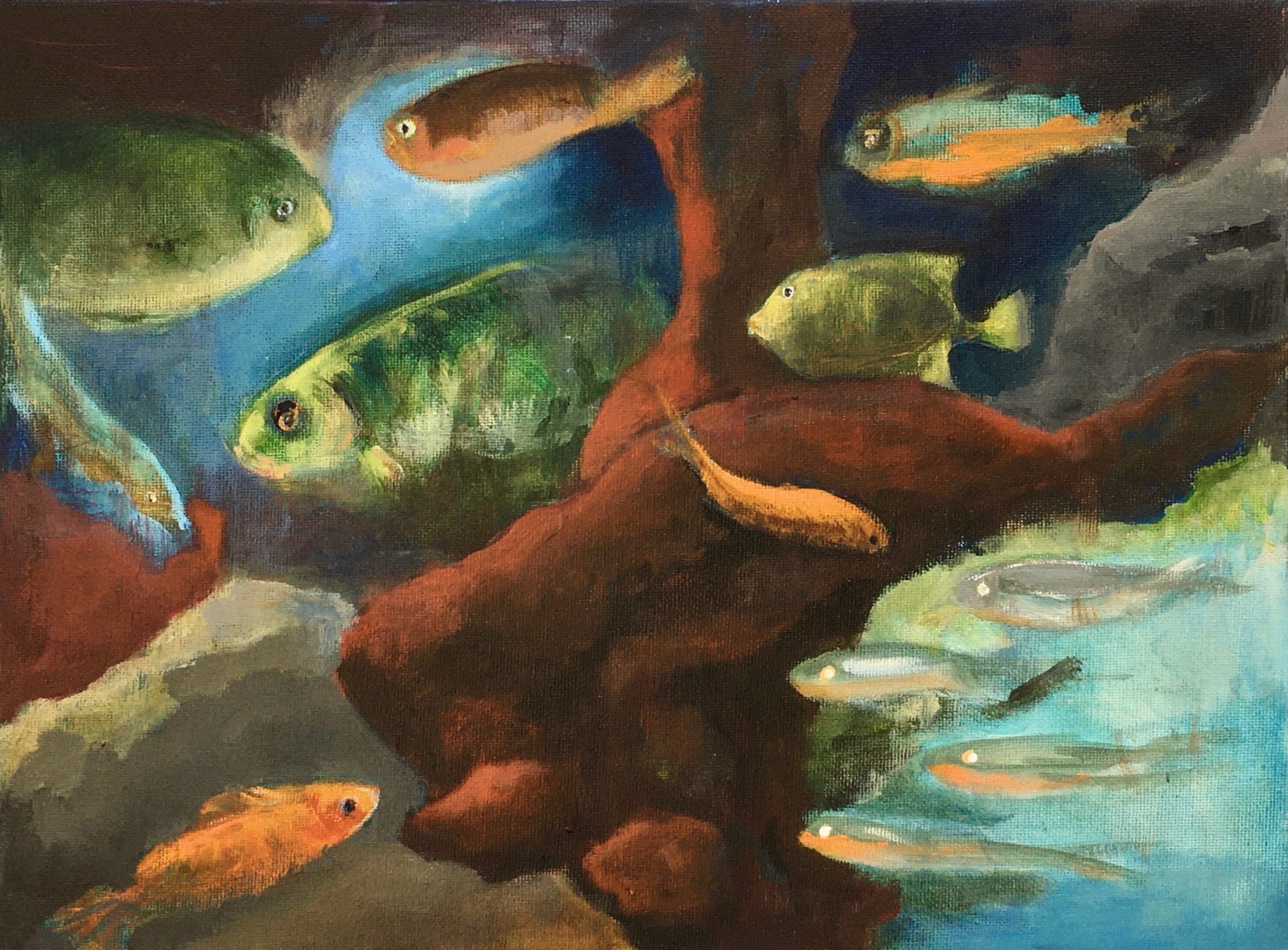 Het Aquarium in Artis is enkele jaren gesloten voor verbouwing. Een paar van mijn favoriete 'bakken' leg ik vast in een schilderij of 'aquariumpje' voordat ze verdwijnen.