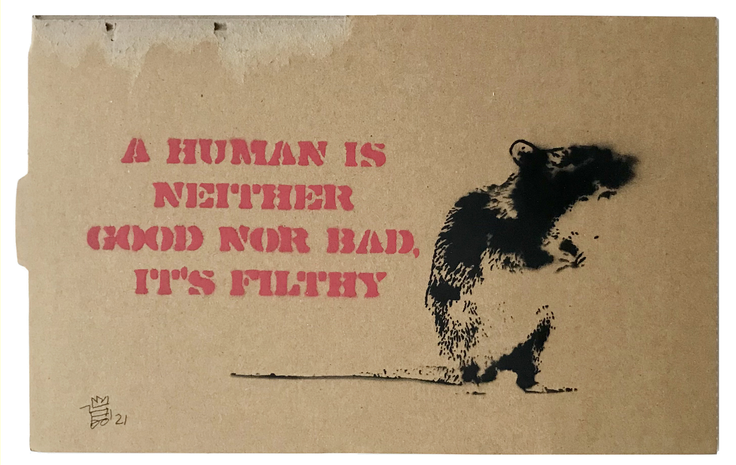 "A Human is neither good nor bad, it's filthy" Kunstenaar/artist: REX (Jurriaan Rexwinkel) Gesigneerd/signed: hand paraaf/Initials Jaar/year: 2021 Papier/paper: Cardboard Techniek/technique: Spuitbus op karton/Spray can on cardboard. Genummerd/number: (1 ) Formaat blad/Size of paper: 20 x 31.5 cm 7,87x12.4 INCH Format image: 20 x 31.5 cm 7,87x12.4 INCH Conditie/Condition: Nieuw/new Comes with authenticity certificate. Do you live in the Netherlands or do you have the possibility to pick up the work, please contact us. If you have any doubts or questions about shipping or payment, please also contact me at studiorexwinkel@gmail.com. Check