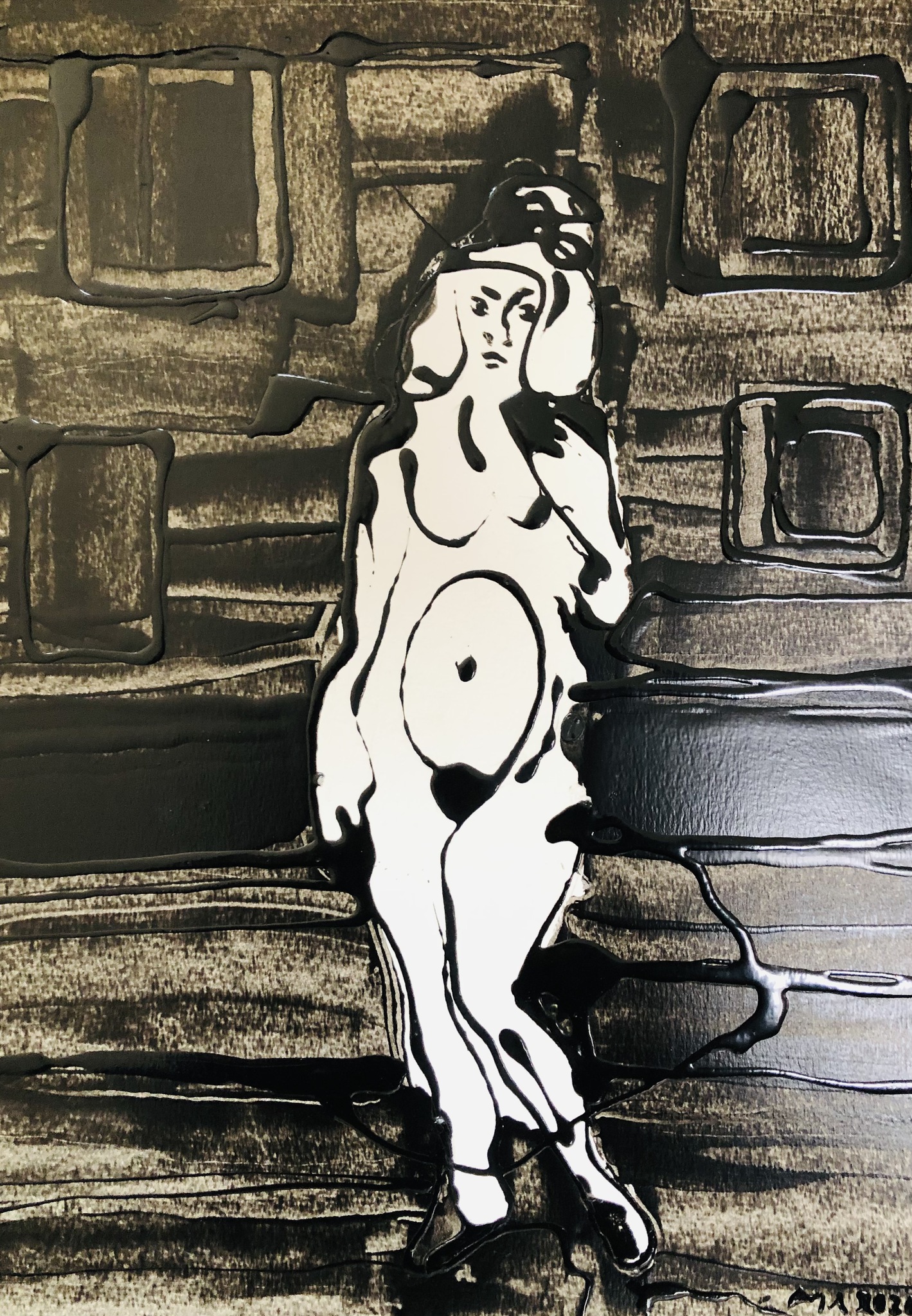 Naked lady with black background. Dit schildery is gemaakt met hamerite op papier. Deels druipend op papier, deels met plamuurmes uitgestreken. Serie 4 van 5.