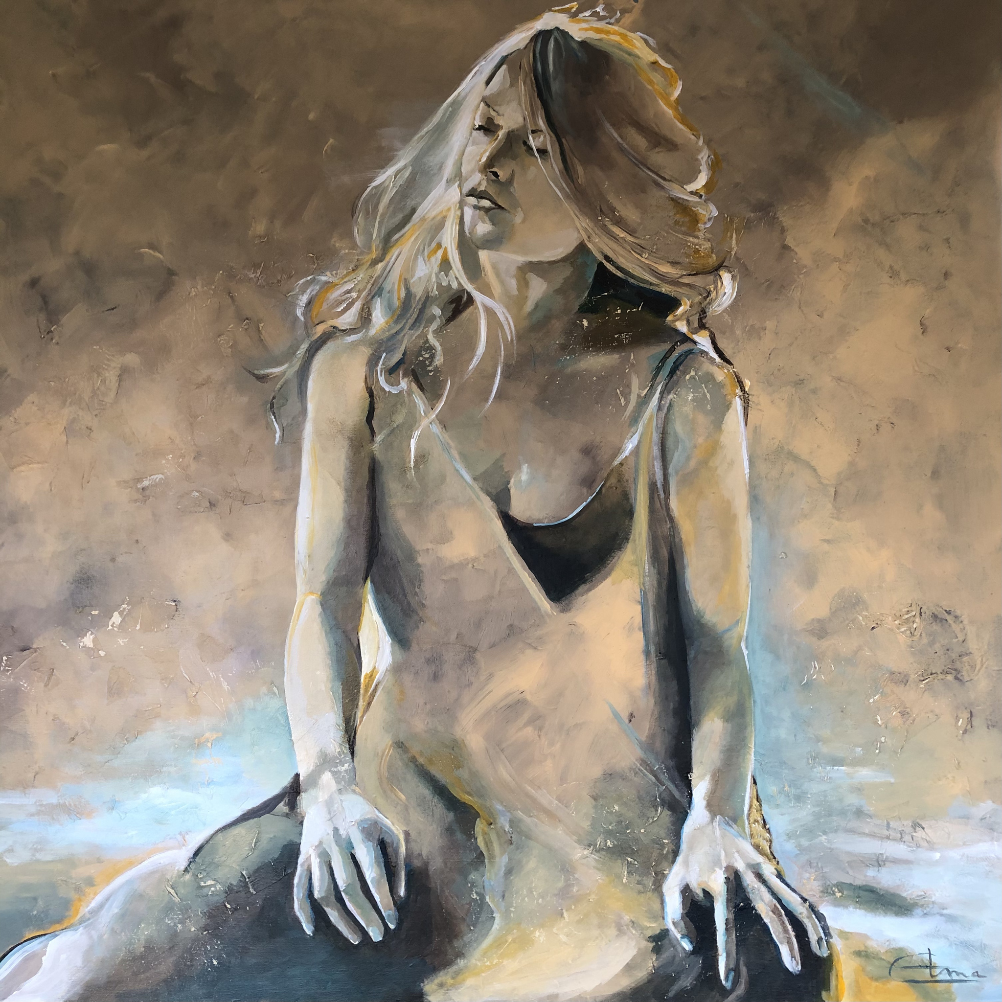 Schilderij Geel Blauw Acryl Vrouw Bruin Licht Figuur