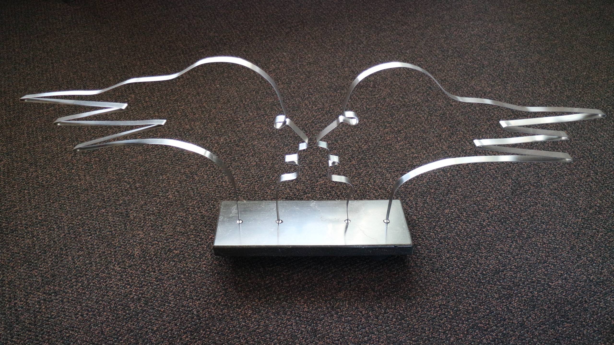Dit sculptuur is gemaakt van RVS strip van 2 cm breed en 1 mm dik. Voor beide koppen was ca 2,5 m strip nodig. De gezichten staan naar elkaar toegekeerd, maar hebben beide tegenwind. Het is ook een beetje alsof je in de spiegel kijkt. Maar het kan een stelletje zijn, die elkaar niet helemaal begrijpen.