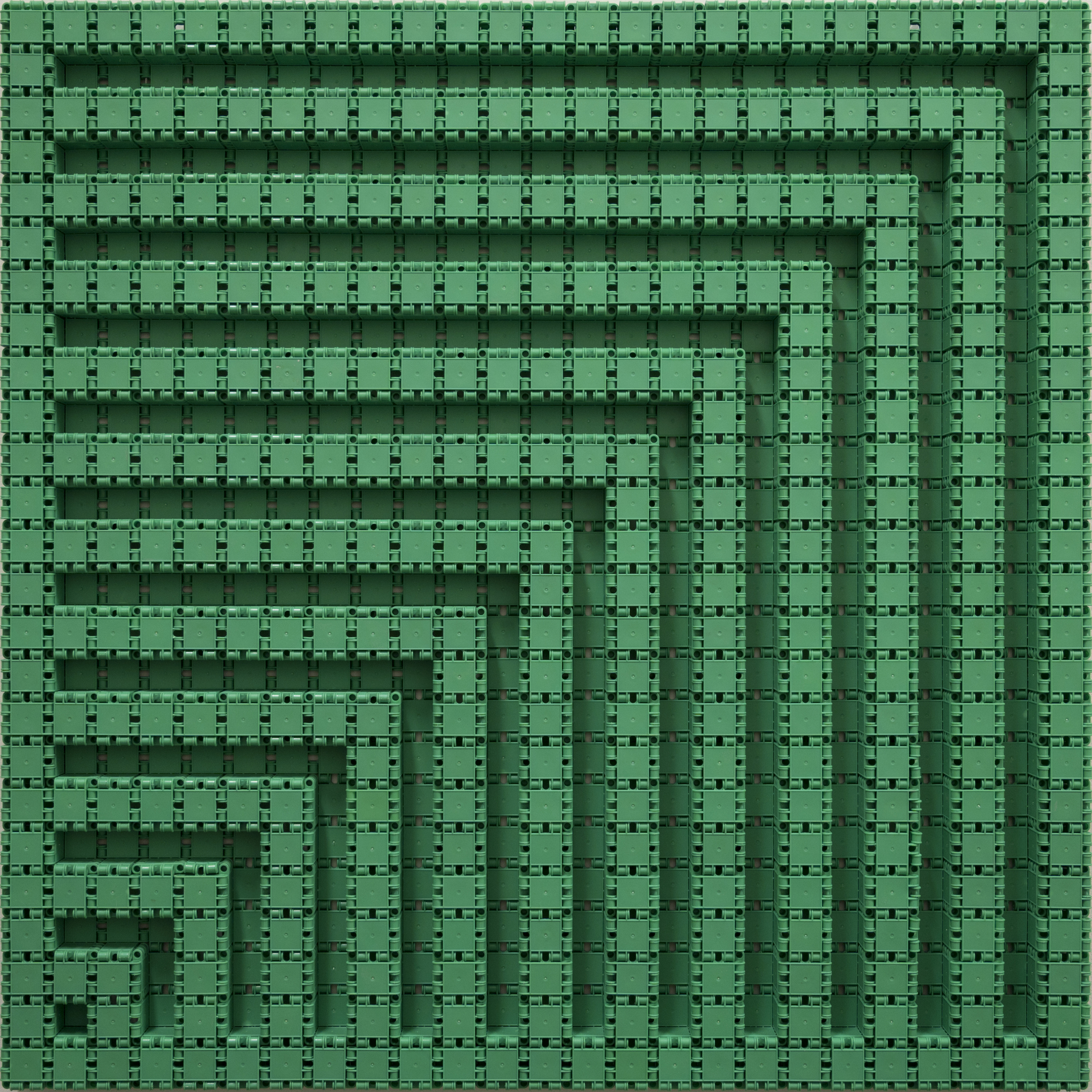 Tijdens de pandemie heeft Nico Kok veel gebruikt constructiespeelgoed verzameld bij kringloopwinkels en internet, waaronder "clics". In dit werk gebruikte hij alleen de groene clics: 1291 groene clics zijn gecombineerd tot een reliëf van twaalf vierkanten. Alle vierkanten hebben twee zijden gemeen. Door deze opstelling wordt een diagonaal in de vierkanten steeds duidelijker naarmate het vierkant groter wordt. Elke klik is ook een vierkant. Clics zijn er alleen in rood, geel, groen, blauw, wit en zwart. Het werk is uit elkaar te halen en op een andere manier weer in elkaar te zetten. Dit is niet de bedoeling, maar draagt bij aan de beleving van dit werk. Het werk reflecteert op de beweging van de Nul-groep (Jan Schoonhoven, Armando) en op de minimal artist Frank Stella. Thema's van Nico Kok zoals: vierkant, wat kan er met de vorm gedaan worden, gebruik van materiaaleigenschappen, gebruik van monochrome kleur, contrast positief / negatief, diagonaal, etc., Komen terug in dit werk. Het werk is op de achterkant gesigneerd.