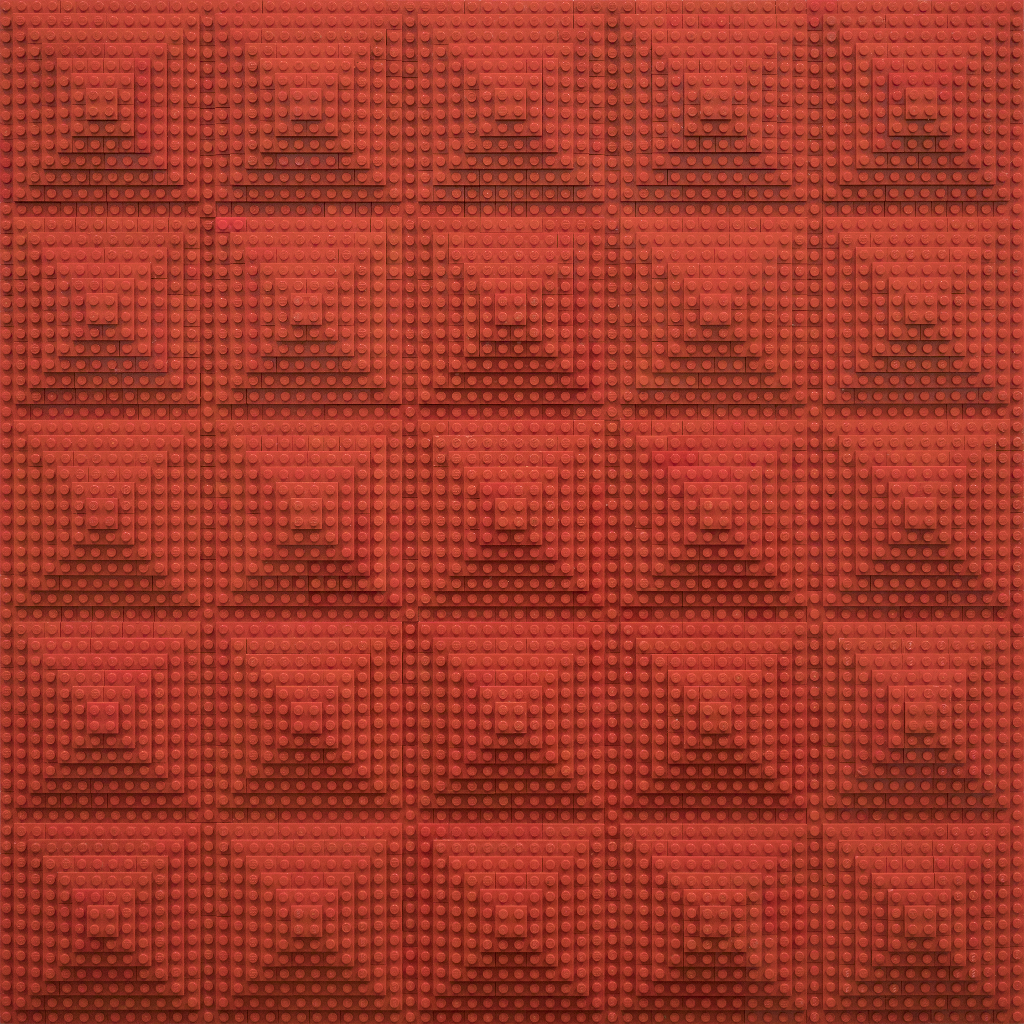 Tijdens de pandemie heeft Nico Kok veel gebruikt constructiespeelgoed ingezameld bij kringloopwinkels en internet, waaronder lego In dit werk gebruikte hij alleen de rood lego: Ongeveer 1000 rode legoplaatjes zijn gecombineerd tot een reliëf van vijfentwintig piramides. Maar in dit werk zie je ook een verschillende vierkant patronen. Het werk is uit elkaar te halen en op een andere manier weer in elkaar te zetten. Dit is niet de bedoeling, maar draagt bij aan de beleving van dit werk. Het werk reflecteert op de beweging van de Nul-groep (Jan Schoonhoven, Armando) en op de minimal artist Frank Stella. Thema's van Nico Kok zoals: vierkant, piramide, wat kan er met de vorm gedaan worden, gebruik van materiaaleigenschappen, gebruik van monochrome kleur, patroon, diagonaal, etc., komen terug in dit werk. Het werk is op de achterkant gesigneerd.