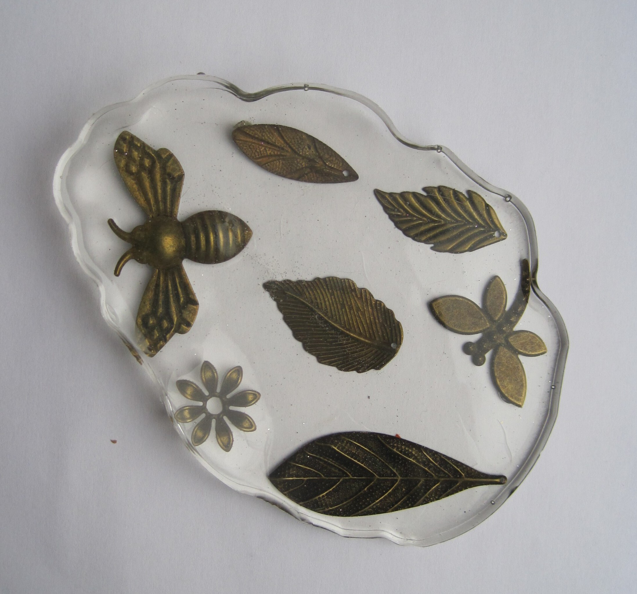 Onderzetter met bronzen vlinders en bloemen. Doorzichtig.