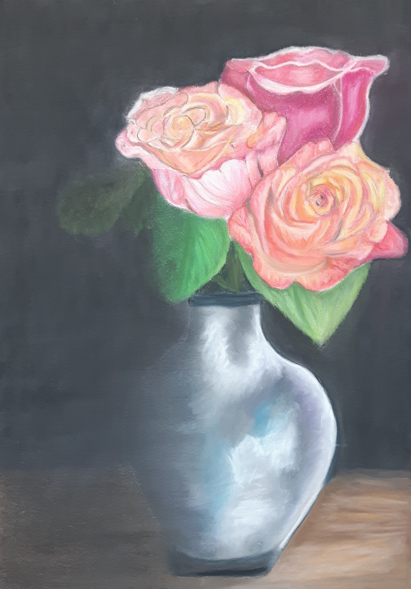Roos in vaas ingelijst met bijpassende passe-partout. Expositie Sint Jozefoord van Kunstkring De Meent te Nuland, thema bloemen 22 maart t/m 21 juni 2021